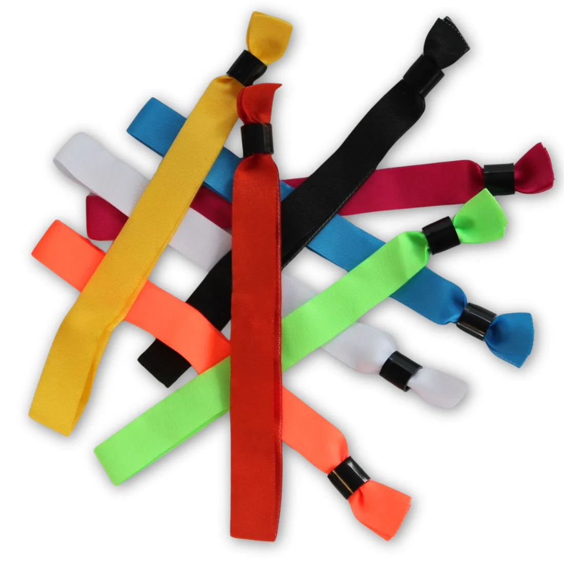 Blank festival wristbands made of fabric. These wristbands measure 340 x 10 mm, making them suitable for both children and adults. Each wristband is secured with a cap-lock closure, which makes it difficult to remove and therefore more secure and tamper-resistant. The fabric is soft, tear-resistant and comfortable to wear, even for multiple days. This makes them a great choice for multi-day festivals, waterparks, resorts, and more. The wristbands are available in packs of 100 and come in various colors to match your event.