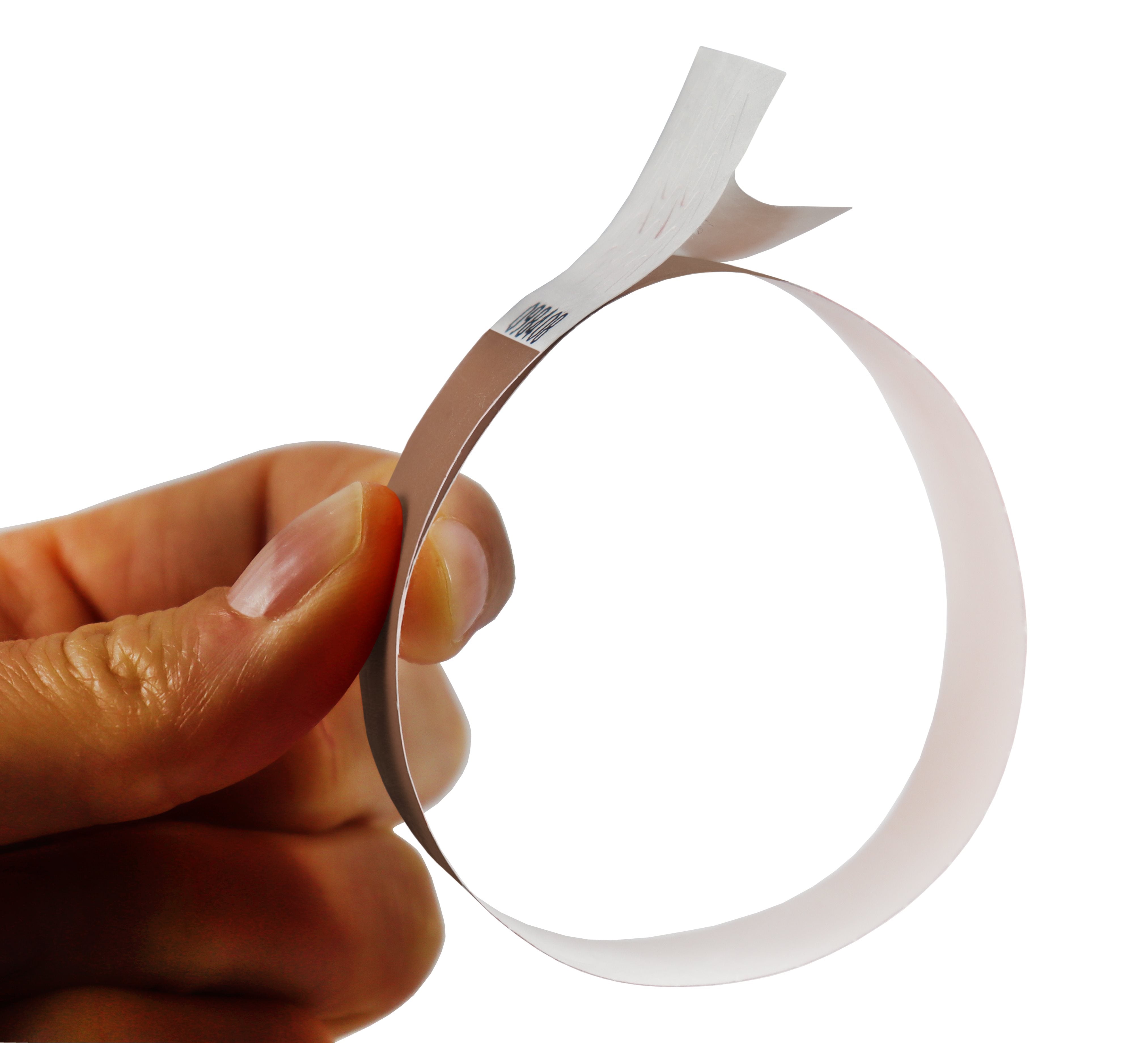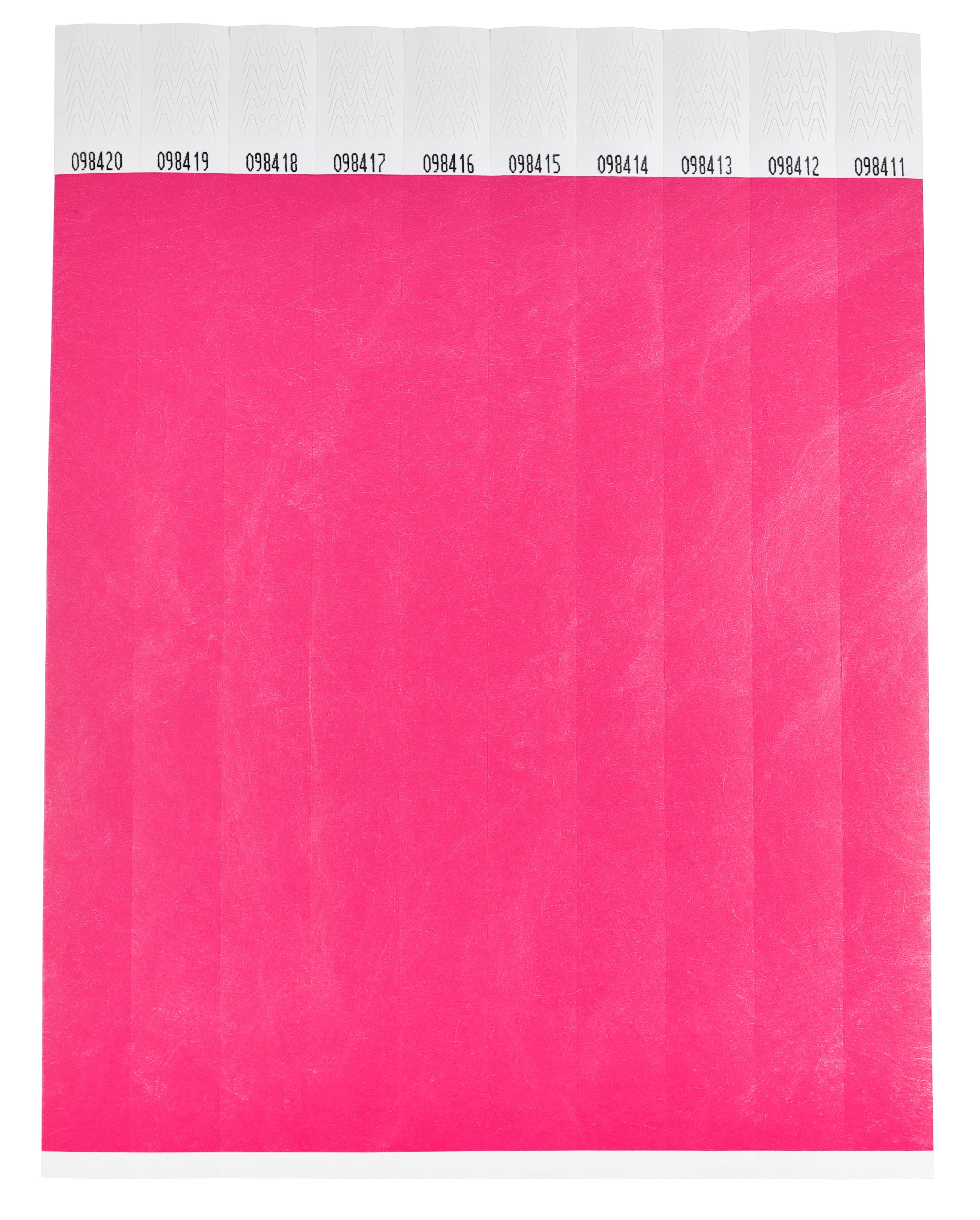 Blank Tyvek wristbands measuring 248 x 19 mm, available in several bright colors. Delivered on sheets of 10 wristbands each, with 10 sheets per pack. Includes numbering and a strong adhesive strip.