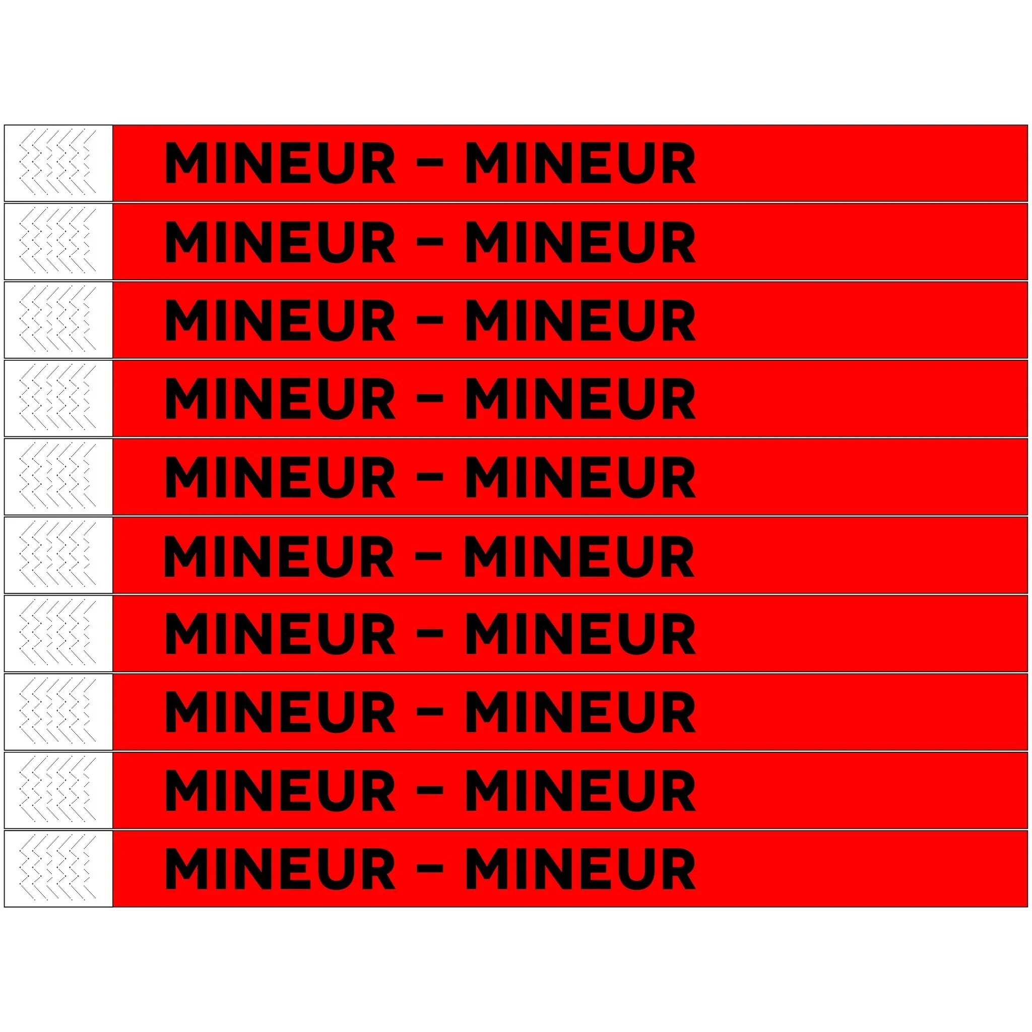 Mineur Tyrex wristbands measuring 248 x 19 mm. These wristbands can be used to mark guests under the legal age for alcohol or entry restrictions. Each pack contains 100 wristbands with numbering and a strong adhesive strip for secure wear.