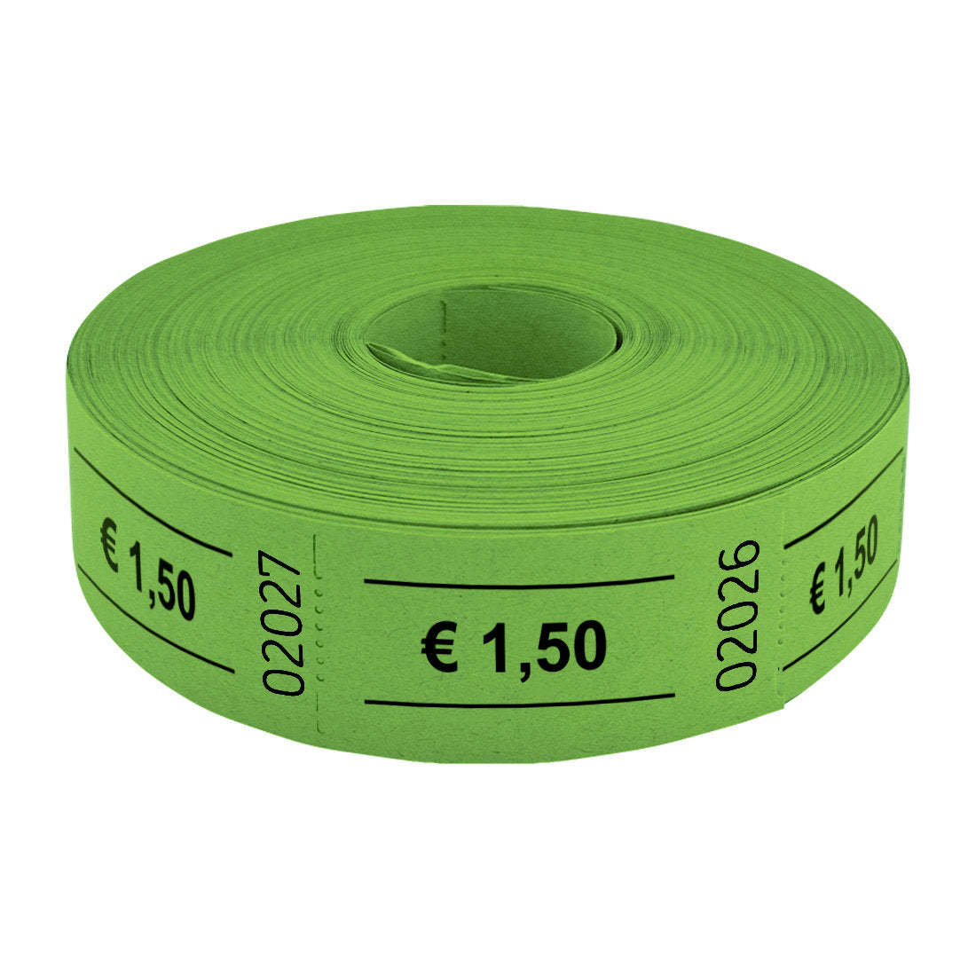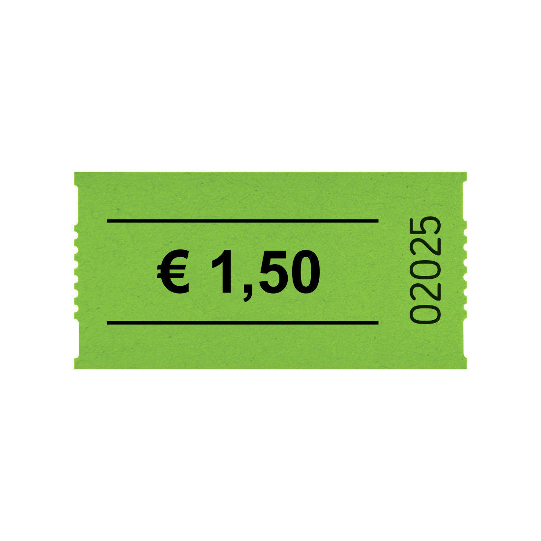 Streamline payments with green €1.50 tickets, perfect for events and gatherings. Each roll contains 1000 tickets, 57 x 30 mm in size, with continuous numbering and easy tear perforation for quick transactions and improved efficiency. Read more