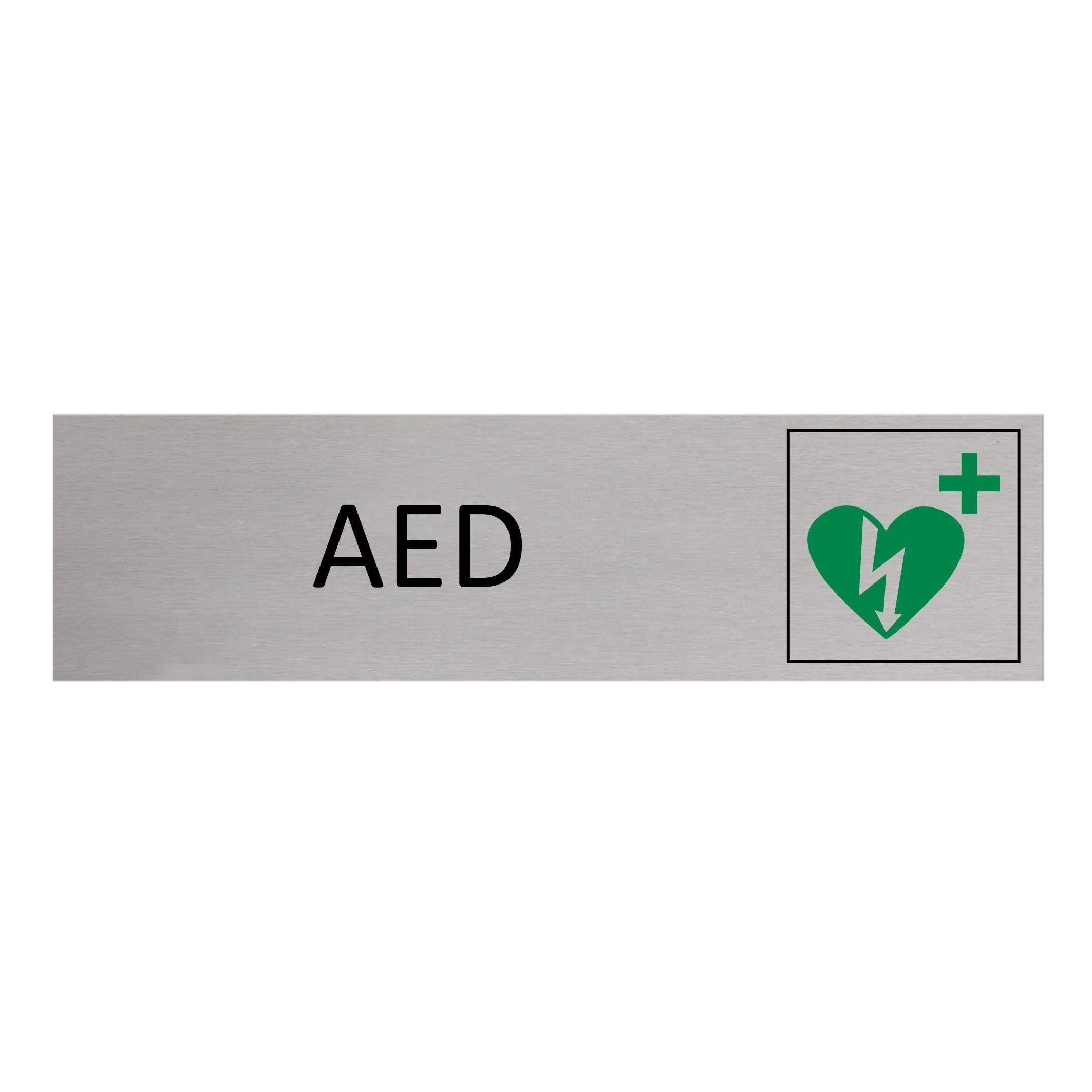 Door sign featuring the text 'AED', made of silver-colored aluminum. The sign measures 165 x 45 mm and has double-sided tape for easy mounting. Suitable for indoor and outdoor use. Sold individually. Read more