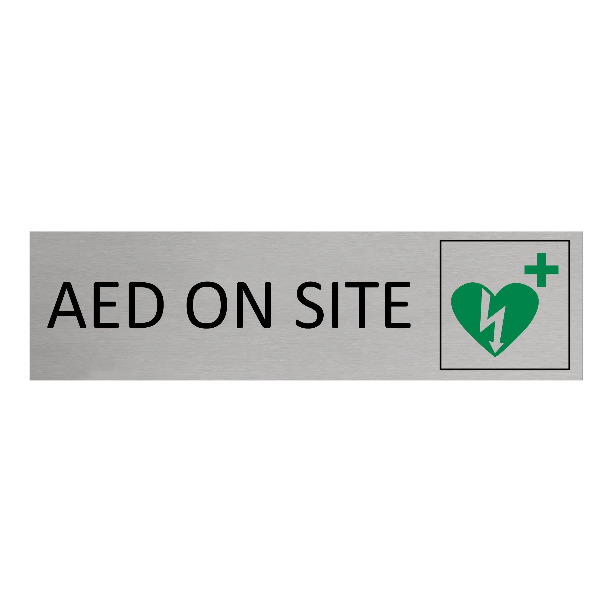 Door sign featuring the text 'AED on site', made of silver-colored aluminum. The sign measures 165 x 45 mm and has double-sided tape for easy mounting. Suitable for indoor and outdoor use. Sold individually.