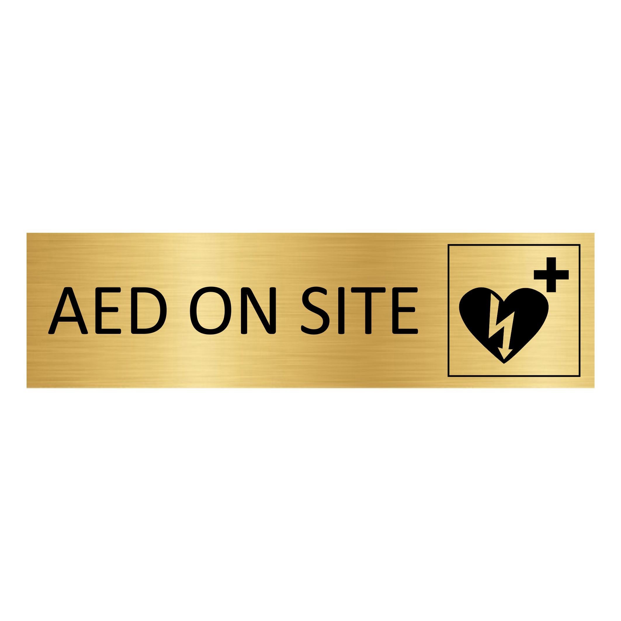 Gold-colored door sign featuring the text 'AED on site', made of high quality aluminum. The sign measures 165 x 45 mm and has double-sided tape for easy mounting. Suitable for indoor and outdoor use. Sold individually.