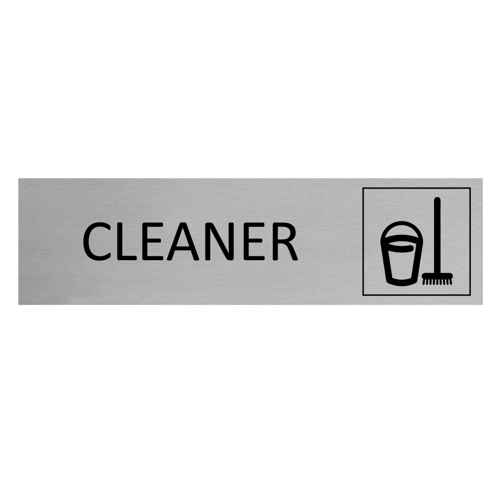Door sign featuring the text 'Cleaner', made of silver-colored aluminum. The sign measures 165 x 45 mm and has double-sided tape for easy mounting. Suitable for indoor and outdoor use. Sold individually.