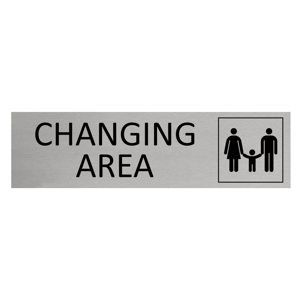 Door sign featuring the text 'Family changing area', made of silver-colored aluminum. The sign measures 165 x 45 mm and has double-sided tape for easy mounting. Suitable for indoor and outdoor use. Sold individually.