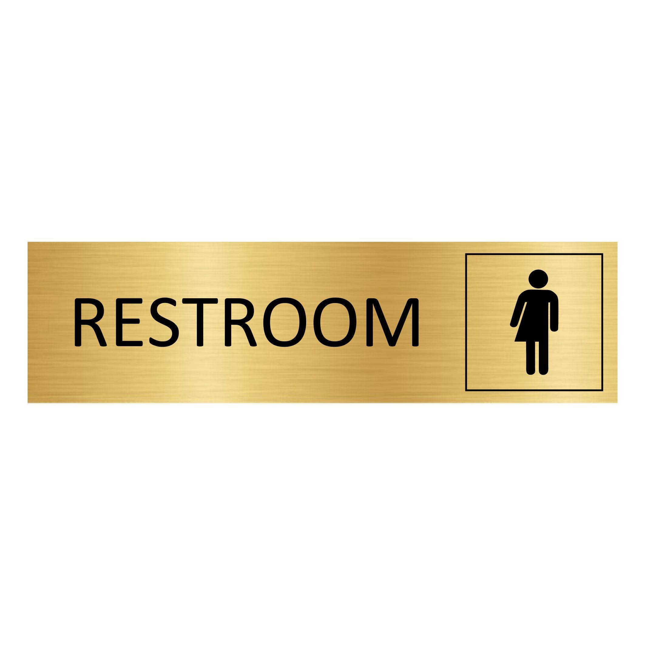 Gold-colored door sign featuring the text 'Restroom', made of high quality aluminum. The sign measures 165 x 45 mm and has double-sided tape for easy mounting. Suitable for indoor and outdoor use. Sold individually. Read more