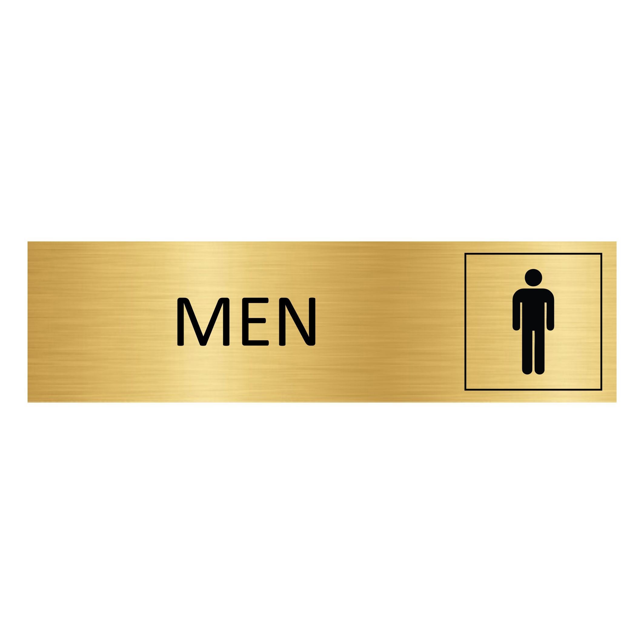 Men's symbol door sign, made of gold-colored aluminum. The sign measures 165 x 45 mm and has a thickness of 0.5 mm. It has double-sided tape on the back for easy installation on doors or walls. Suitable for both indoor and outdoor use. Sold individually.