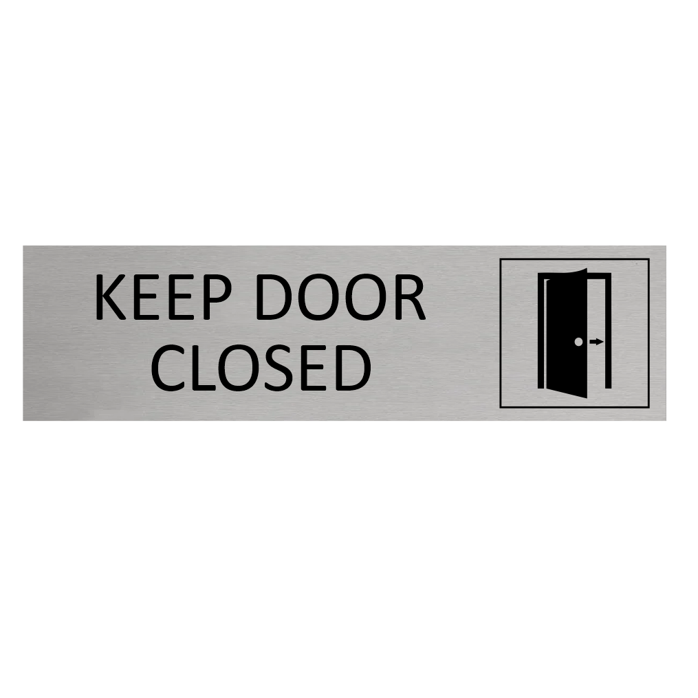 Door sign featuring the text 'Keep door closed', made of silver-colored aluminum. The sign measures 165 x 45 mm and has double-sided tape for easy mounting. Suitable for indoor and outdoor use. Sold individually.