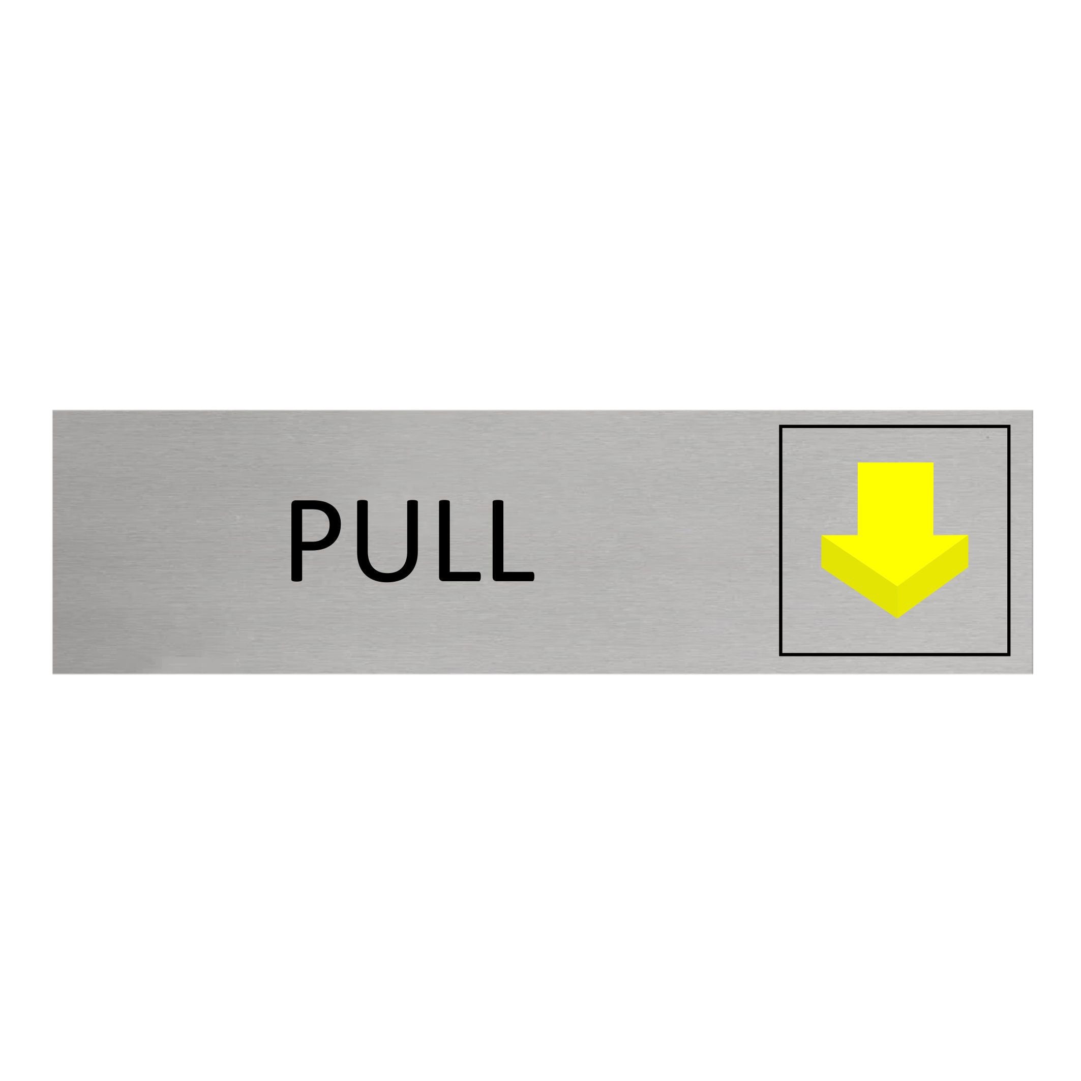 Door sign featuring the text 'Pull', made of silver-colored aluminum. The sign measures 165 x 45 mm and has double-sided tape for easy mounting. Suitable for indoor and outdoor use. Sold individually.