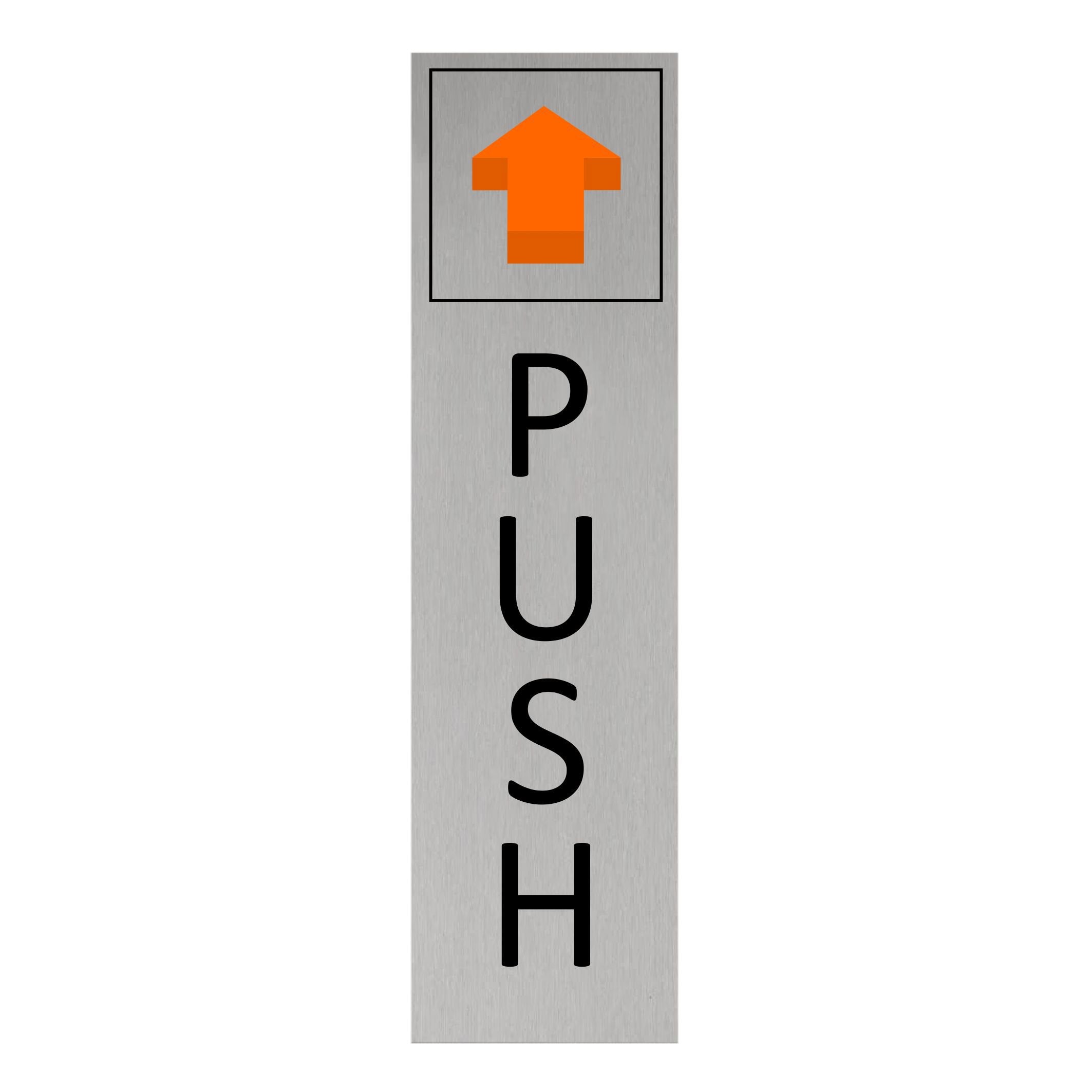 Door sign featuring the text 'Push', made of silver-colored aluminum. The sign measures 165 x 45 mm and has double-sided tape for easy mounting. Suitable for indoor and outdoor use. Sold individually.