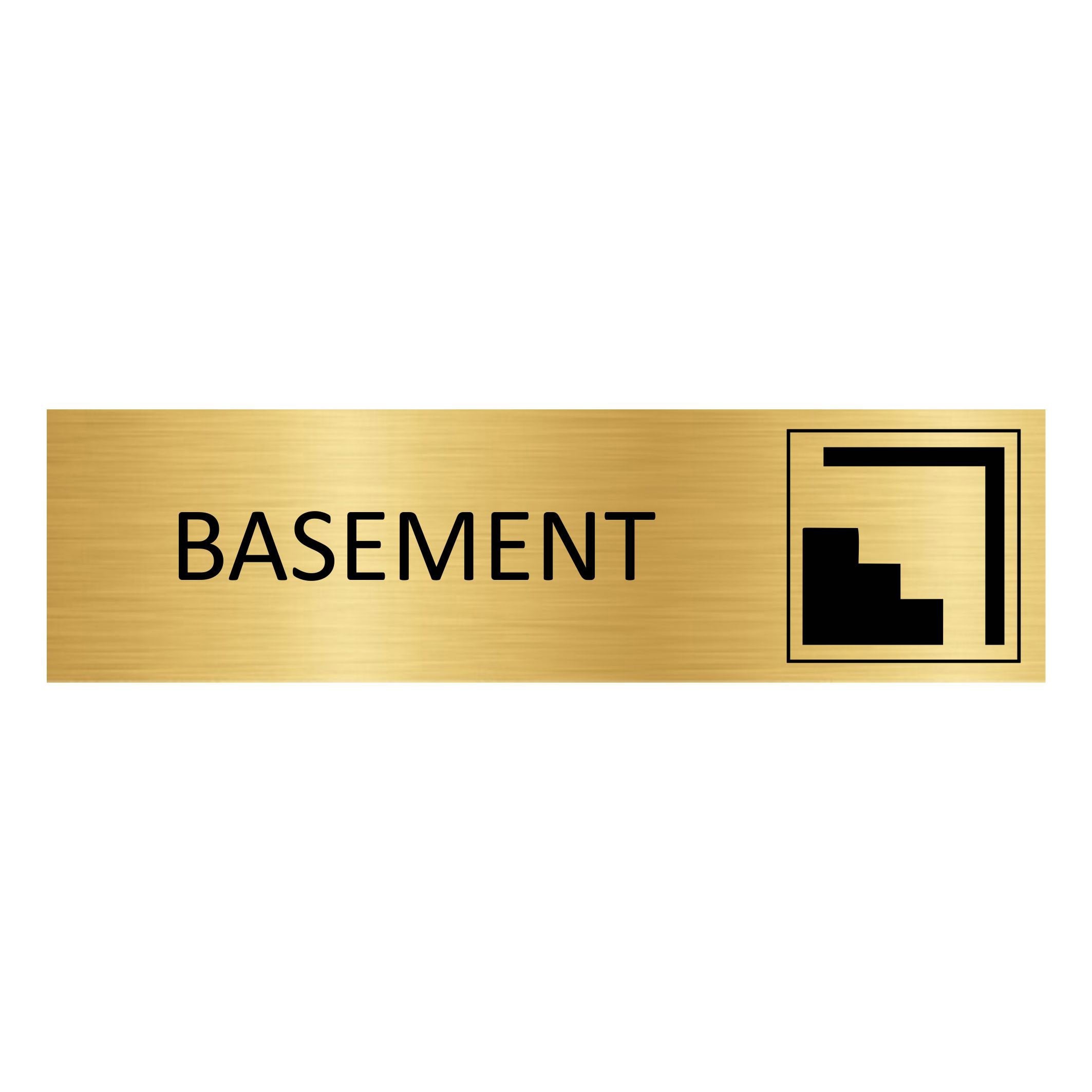 Gold-colored door sign featuring the text 'Basement', made of high quality aluminum. The sign measures 165 x 45 mm and has double-sided tape for easy mounting. Suitable for indoor and outdoor use. Sold individually.
