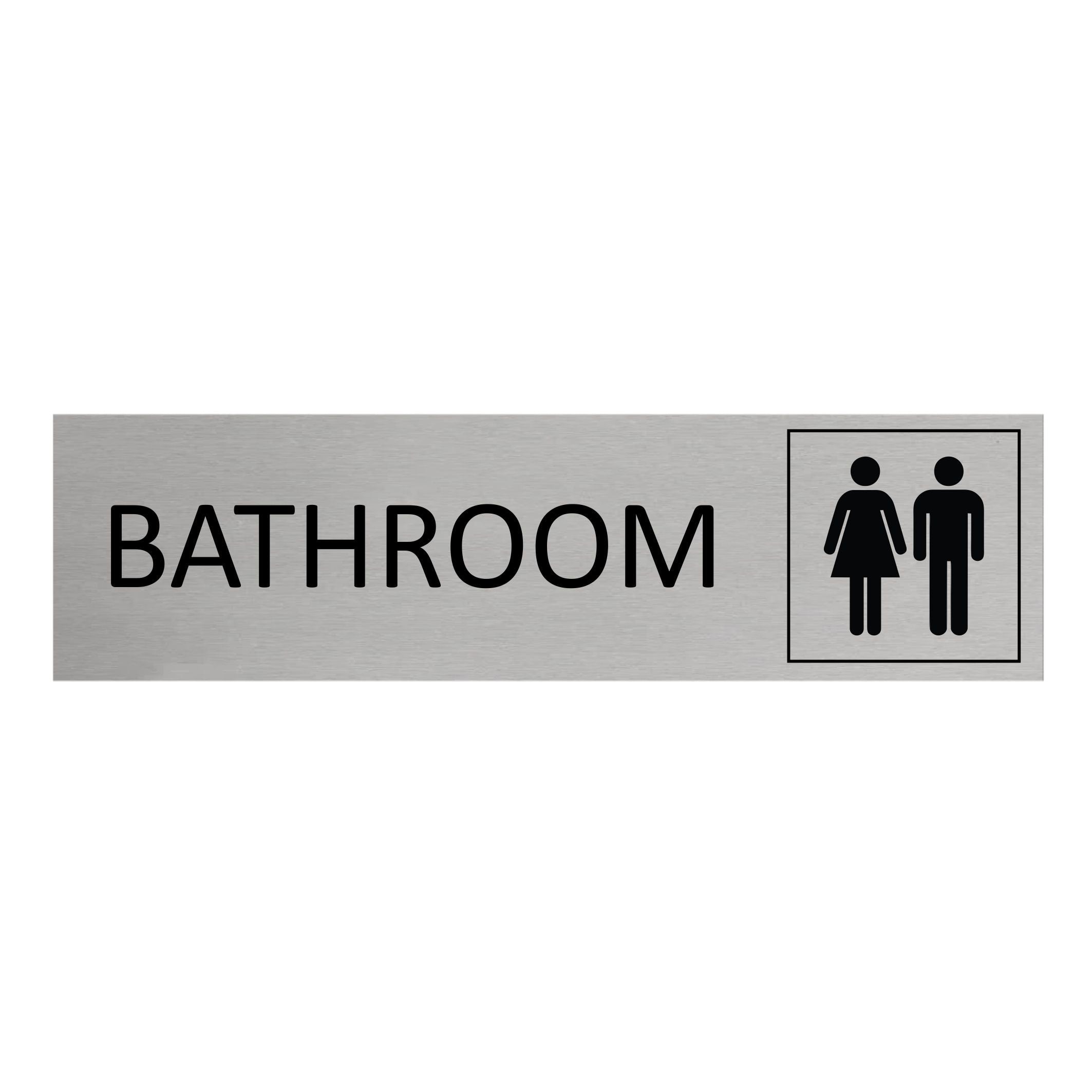 Bathroom door sign, made of silver-colored aluminum. The sign measures 165 x 45 mm and has a thickness of 0.5 mm. It has double-sided tape on the back for easy installation on doors or walls. Suitable for both indoor and outdoor use. Sold individually.