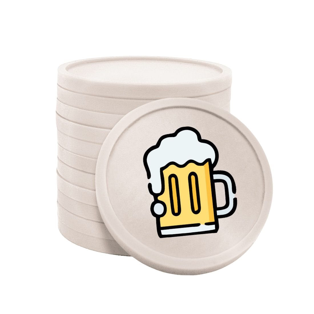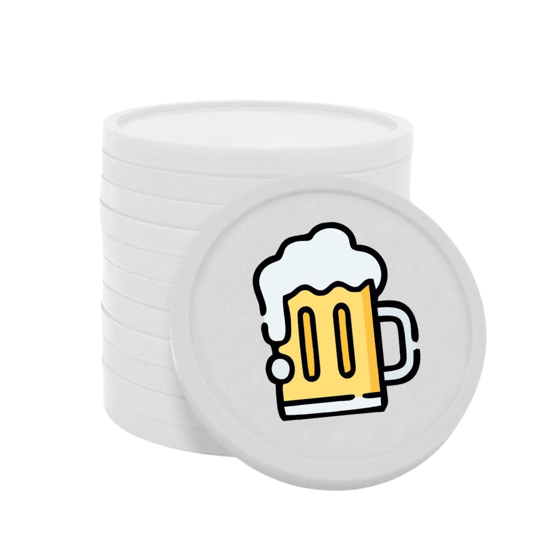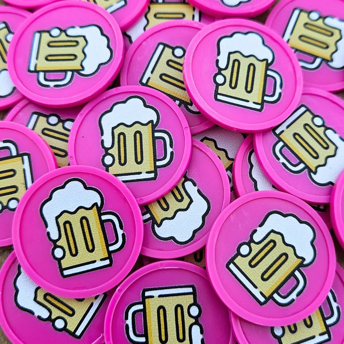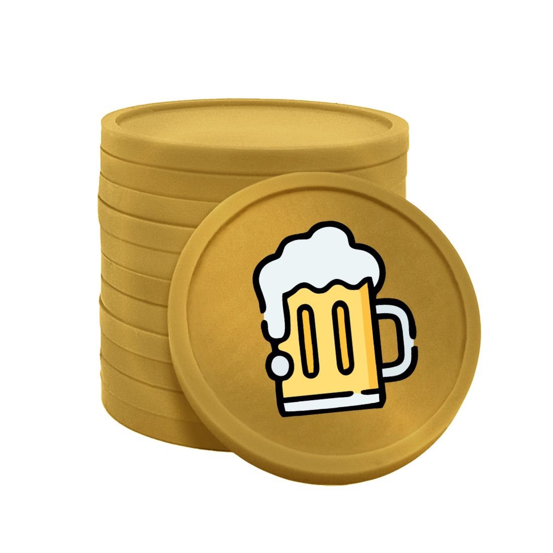 Colorful 29 mm tokens with a recognizable beer icon. The tokens have a raised edge and are approximately 2.35 mm thick. Choose one-sided print or two-sided printing. Ideal as a bar token, drink token, or means of payment. Sold in packs of 100 tokens.
