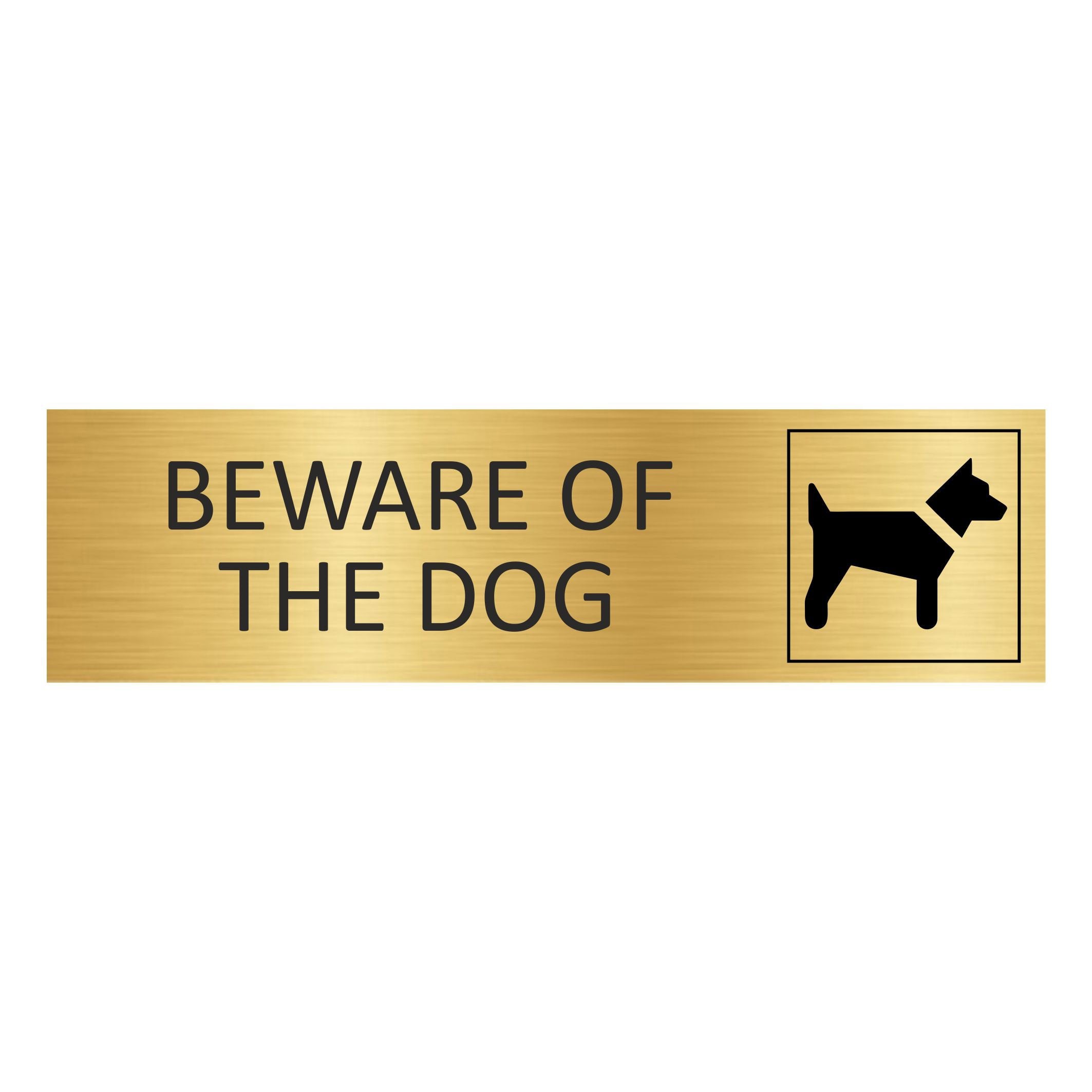 Gold-colored door sign featuring the text 'Beware of the dog', made of high quality aluminum. The sign measures 165 x 45 mm and has double-sided tape for easy mounting. Suitable for indoor and outdoor use. Sold individually. Read more