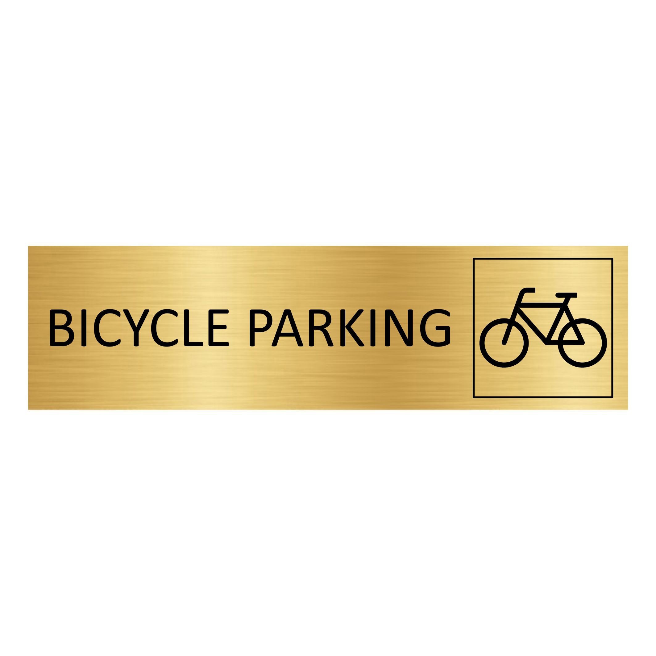 Gold-colored door sign featuring the text 'Bicycle parking', made of high quality aluminum. The sign measures 165 x 45 mm and has double-sided tape for easy mounting. Suitable for indoor and outdoor use. Sold individually.