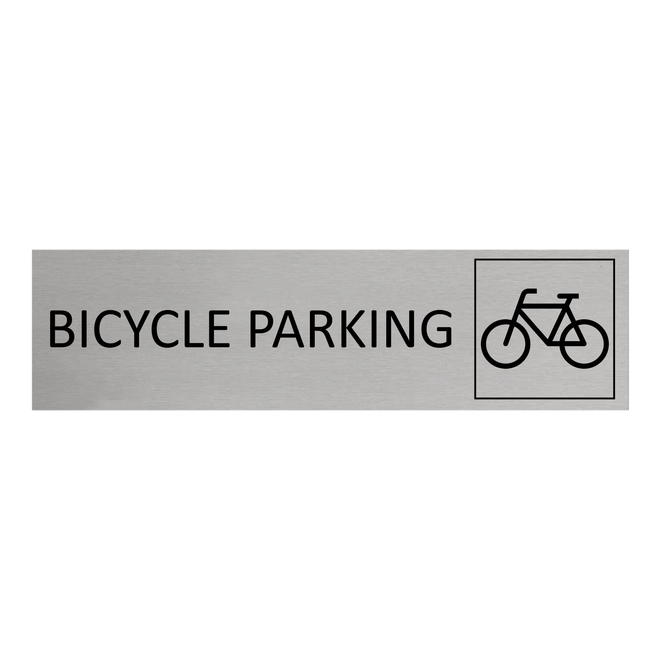 Door sign featuring the text 'Bicycle parking', made of silver-colored aluminum. The sign measures 165 x 45 mm and has double-sided tape for easy mounting. Suitable for indoor and outdoor use. Sold individually.