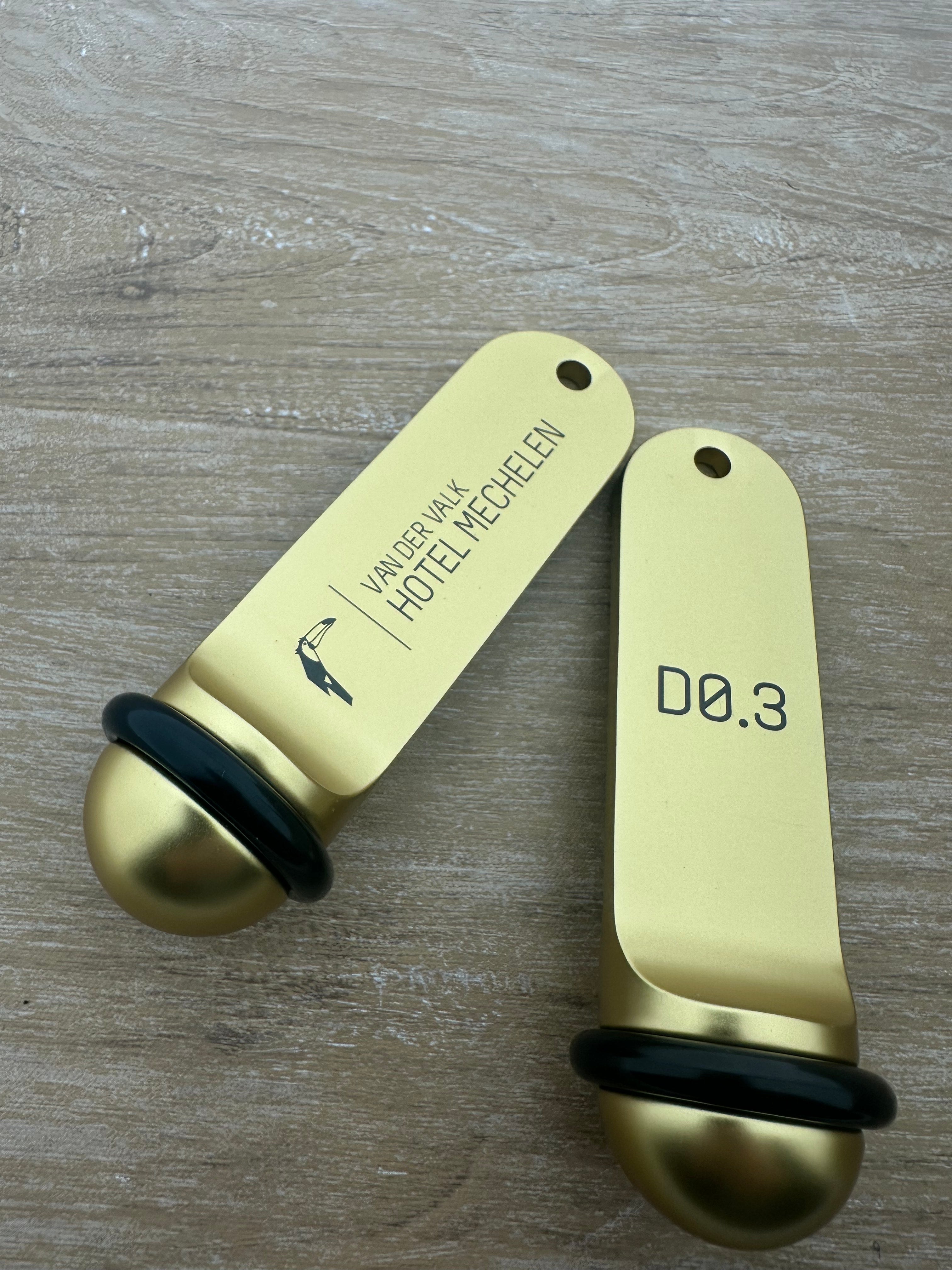 The gold Big Classic can be customized with black engraving. Personalize the hotel keychain with text, number, or logo. This makes the gold Big Classic suitable for any hotel chain, B&B, or motel. Dimensions: 105 x 30 mm, made of solid aluminum. Read more
