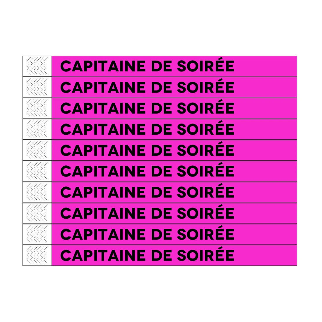 Capitaine de soirée Tyrex wristbands measuring 248 x 19 mm. These wristbands are perfect to identify the host at events, bars, or clubs. Each pack contains 100 wristbands with numbering and a strong adhesive strip for secure wear.