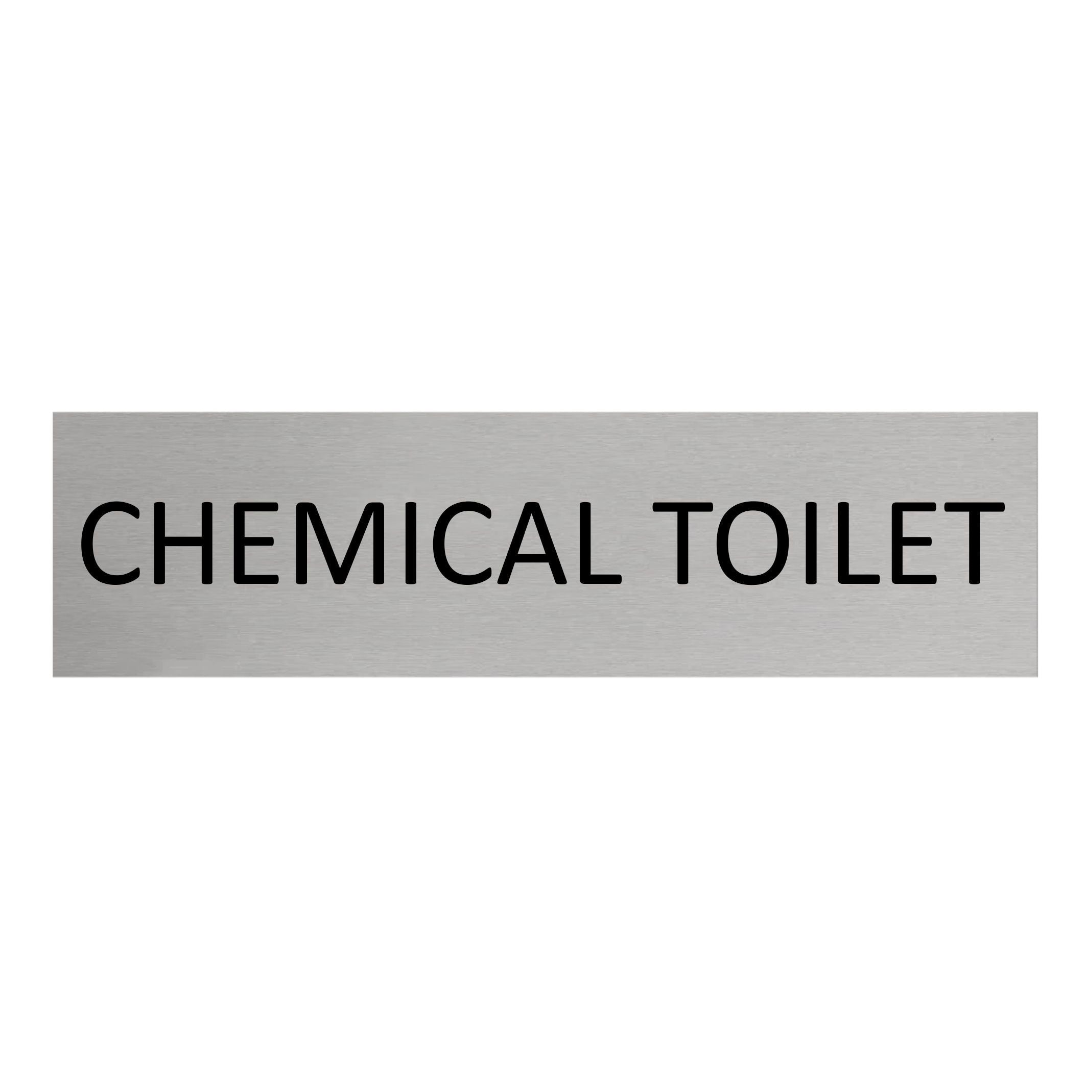 Door sign featuring the text 'Chemical toilet', made of silver-colored aluminum. The sign measures 165 x 45 mm and has double-sided tape for easy mounting. Suitable for indoor and outdoor use. Sold individually.
