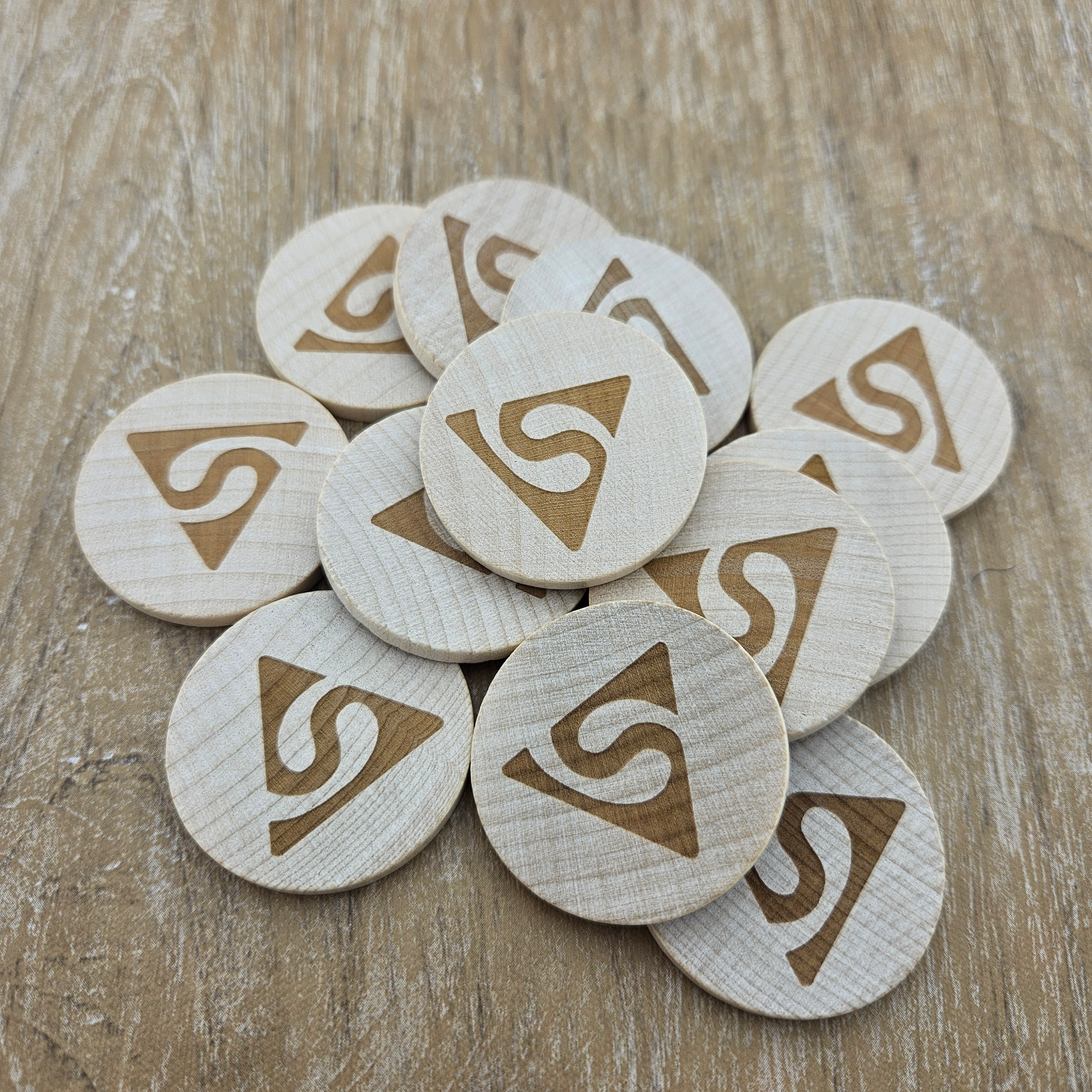 Since this is a natural product, the dimensions may slightly vary. The tokens are made from 100% maple wood, which is not only eco-friendly but also a beautiful, strong, and smooth material. The token is coated with a thin, transparent lacquer to protect the engraving. The tokens are sold in packs of 50.