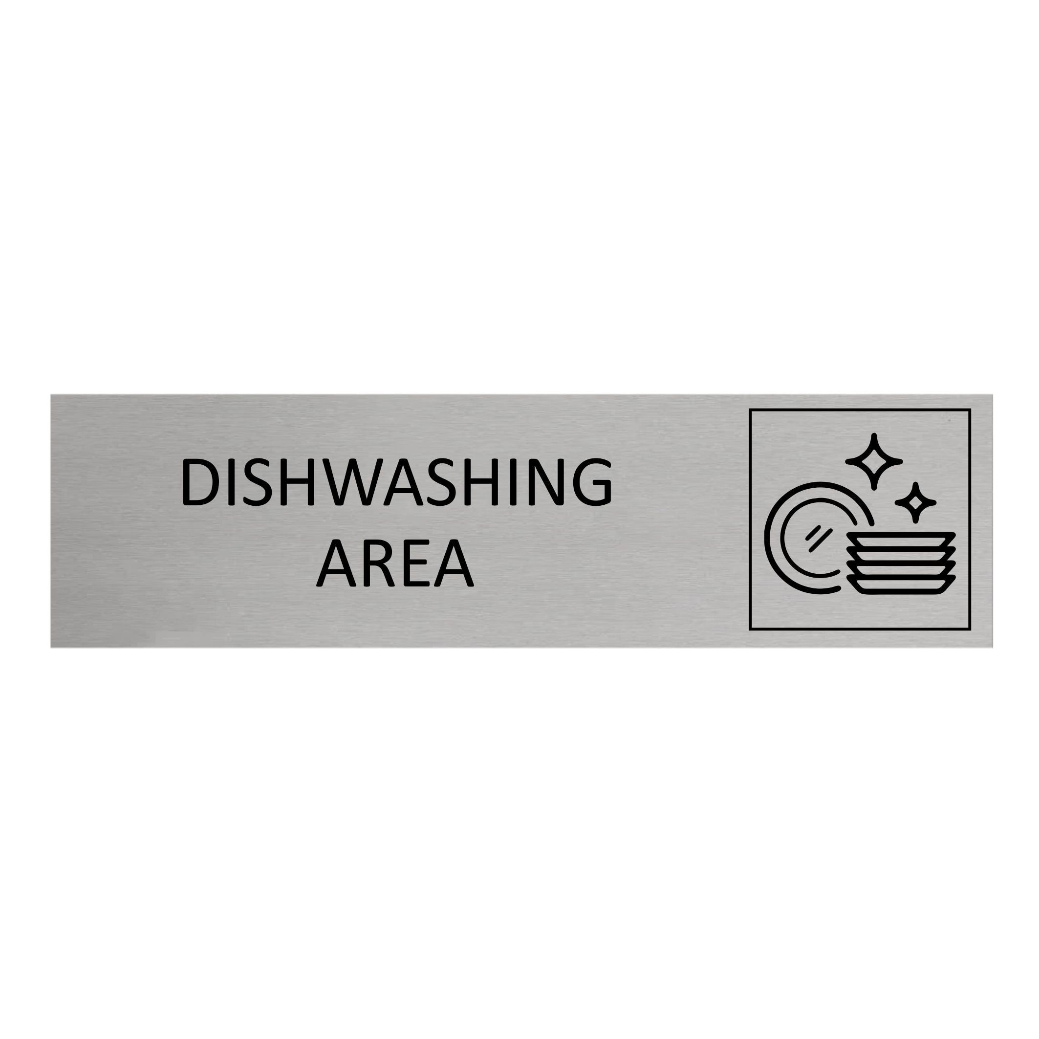 Door sign featuring the text 'Dishwashing area', made of silver-colored aluminum. The sign measures 165 x 45 mm and has double-sided tape for easy mounting. Suitable for indoor and outdoor use. Sold individually.