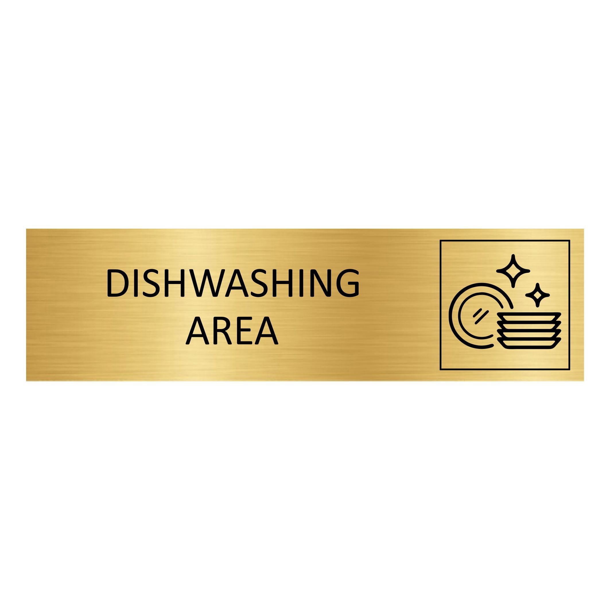 Gold-colored door sign featuring the text 'Dishwashing area', made of high quality aluminum. The sign measures 165 x 45 mm and has double-sided tape for easy mounting. Suitable for indoor and outdoor use. Sold individually.