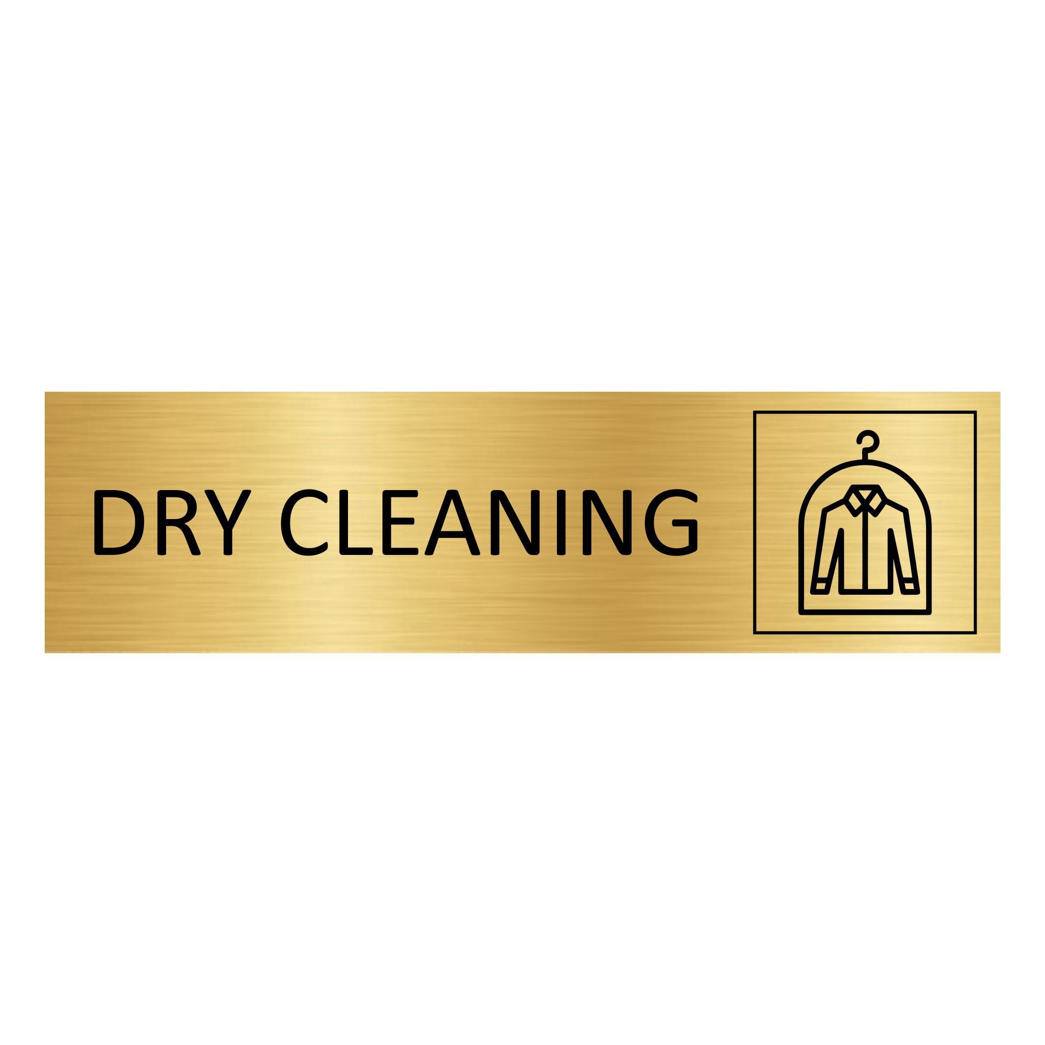 Gold-colored door sign featuring the text 'Dry cleaning', made of high quality aluminum. The sign measures 165 x 45 mm and has double-sided tape for easy mounting. Suitable for indoor and outdoor use. Sold individually.