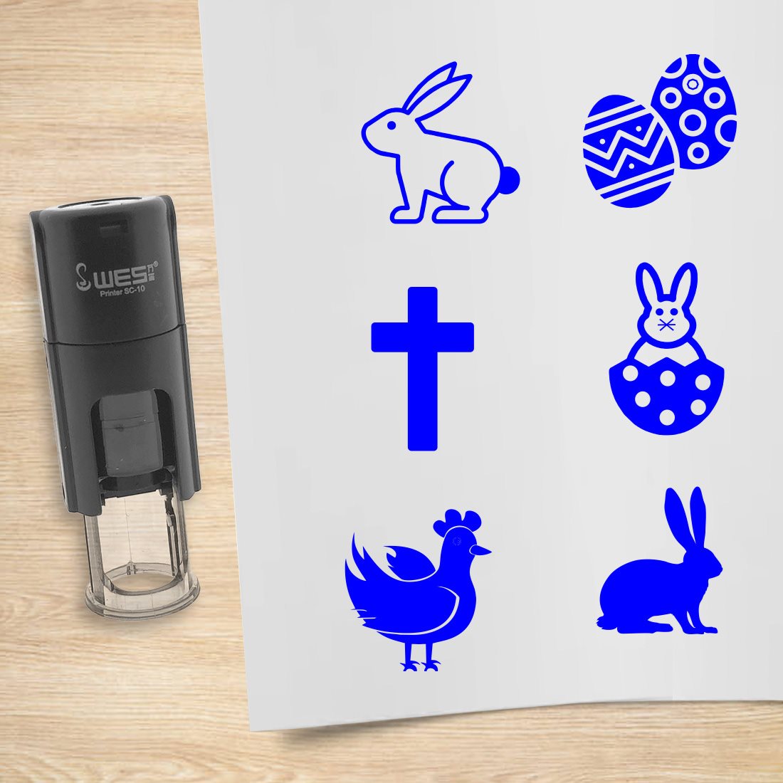The Easter stamp set includes: a bunny, Easter eggs, a cross, an Easter bunny in an egg, a chick, and an Easter bunny. The perfect set for your bullet journals, calendars, planners, and much more. The print surface is approximately 10 mm. Each stamp has an internal ink pad that you can refill with ink.