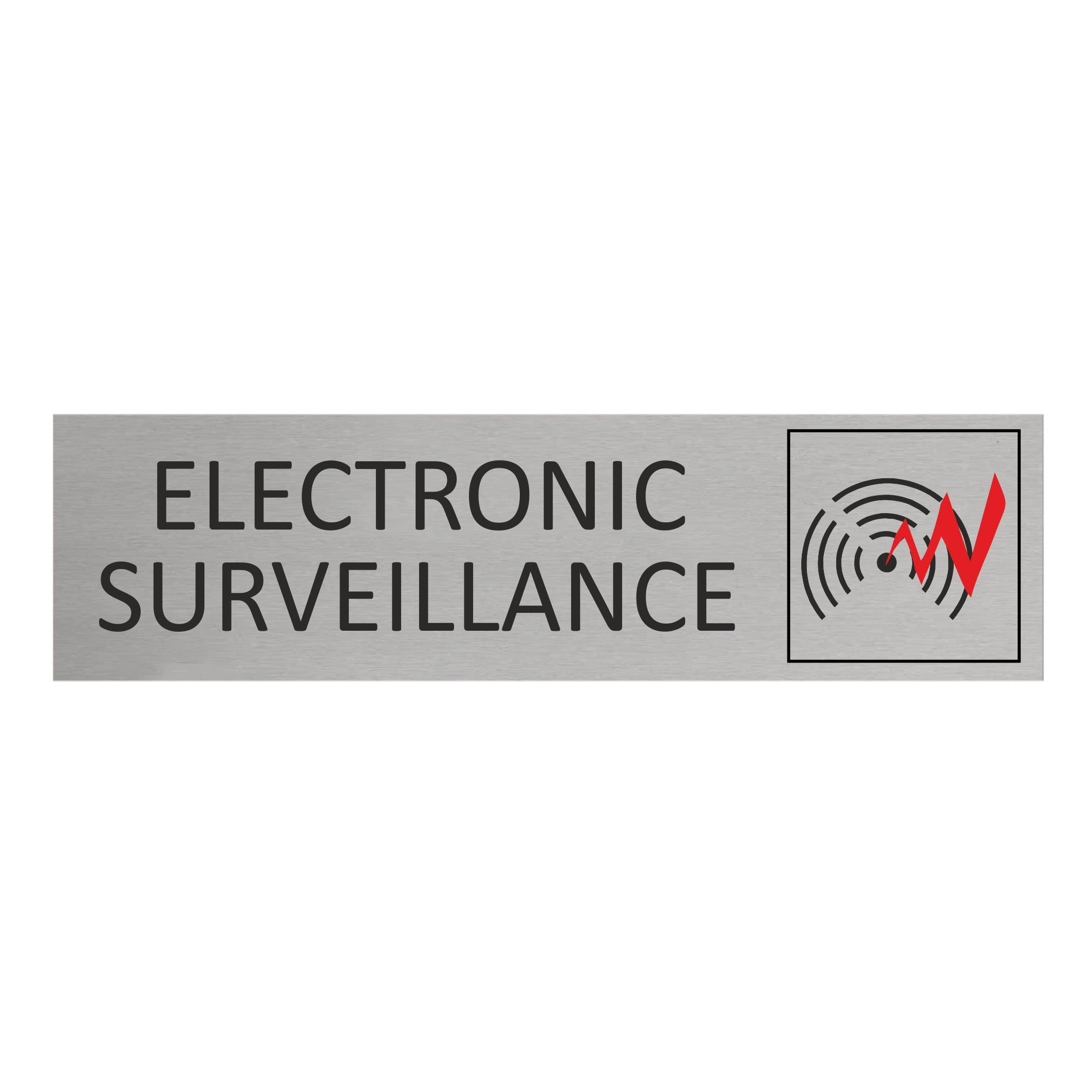 Door sign featuring the text 'Electronic surveillance', made of silver-colored aluminum. The sign measures 165 x 45 mm and has double-sided tape for easy mounting. Suitable for indoor and outdoor use. Sold individually.