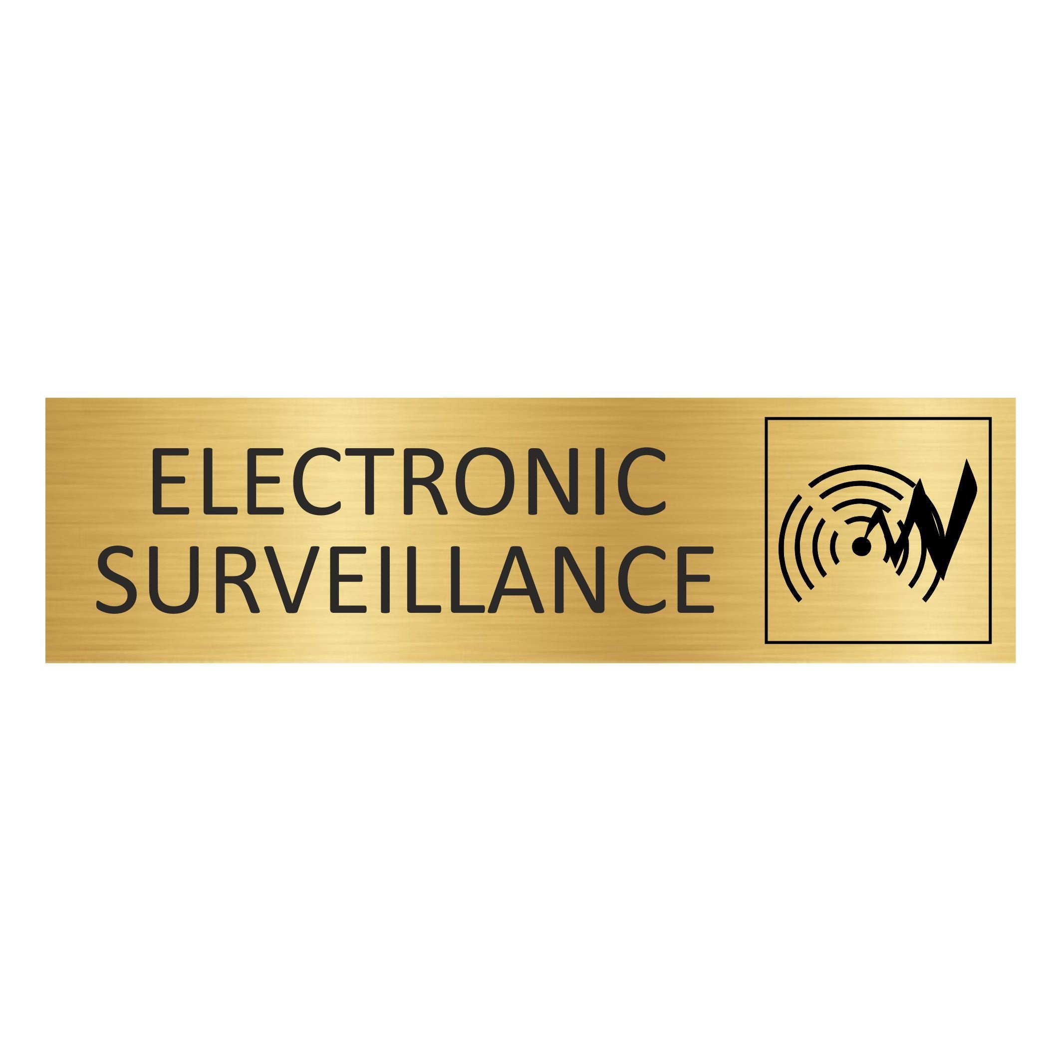 Gold-colored door sign featuring the text 'Electronic surveillance', made of high quality aluminum. The sign measures 165 x 45 mm and has double-sided tape for easy mounting. Suitable for indoor and outdoor use. Sold individually. Read more