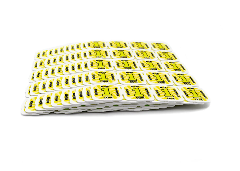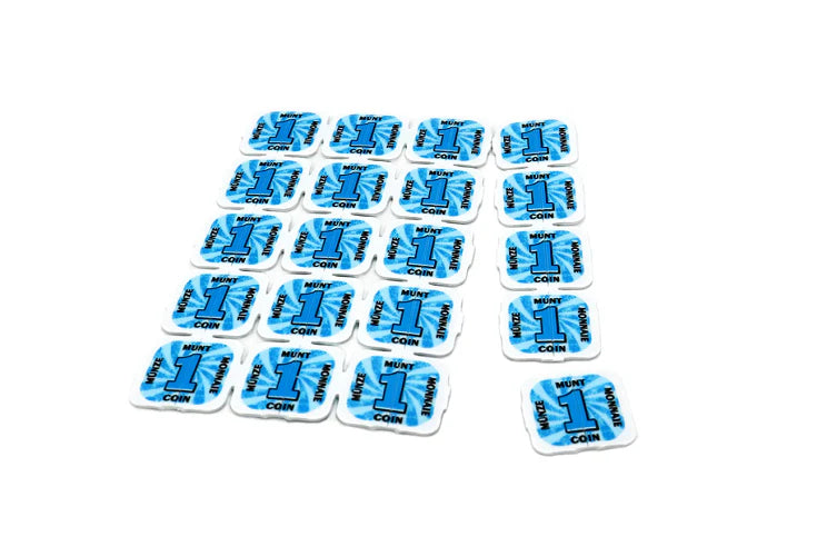 Break-off tokens on sheets of 40 tokens. Each token features the number 1 and the words 'munt,' 'münze,' 'coin,' and 'monnaie,' making them internationally usable. Ideal for use at parties, festivals, and more. One-sided print, Sold in packs of 1000 tokens. Read more