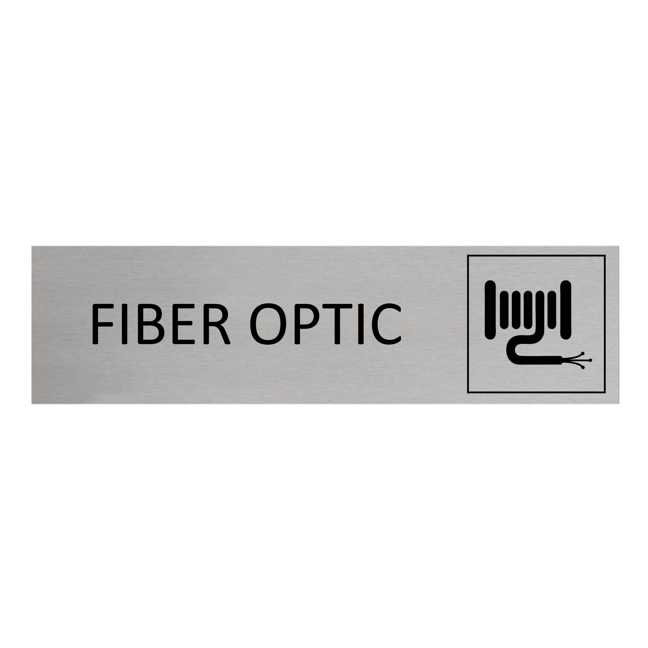 Door sign featuring the text 'Fiber optic', made of silver-colored aluminum. The sign measures 165 x 45 mm and has double-sided tape for easy mounting. Suitable for indoor and outdoor use. Sold individually.