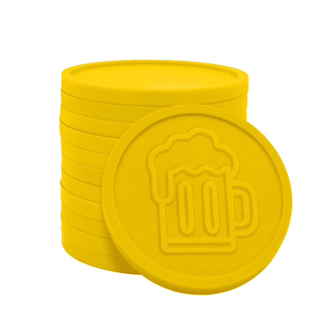 Fichas amarillas en relieve con el icono de una jarra de cerveza para festivales y eventos. Tienen un diámetro de 29 mm y un grosor de 2,35 mm. Estas prácticas fichas facilitan el pedido en el bar, tanto para los visitantes como para el personal. Se venden en paquetes de 250 unidades.