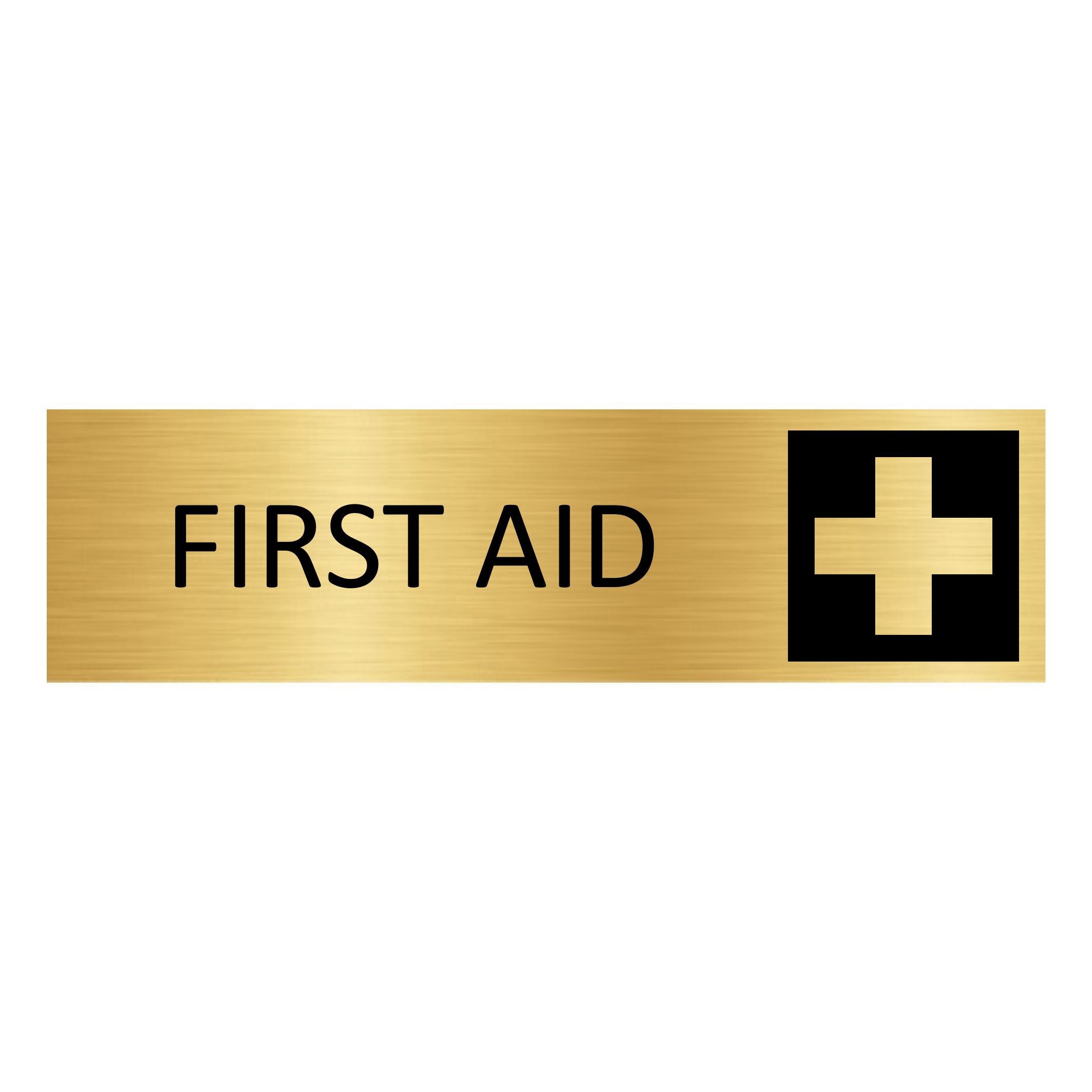 Gold-colored door sign featuring the text 'First aid', made of high quality aluminum. The sign measures 165 x 45 mm and has double-sided tape for easy mounting. Suitable for indoor and outdoor use. Sold individually. Read more