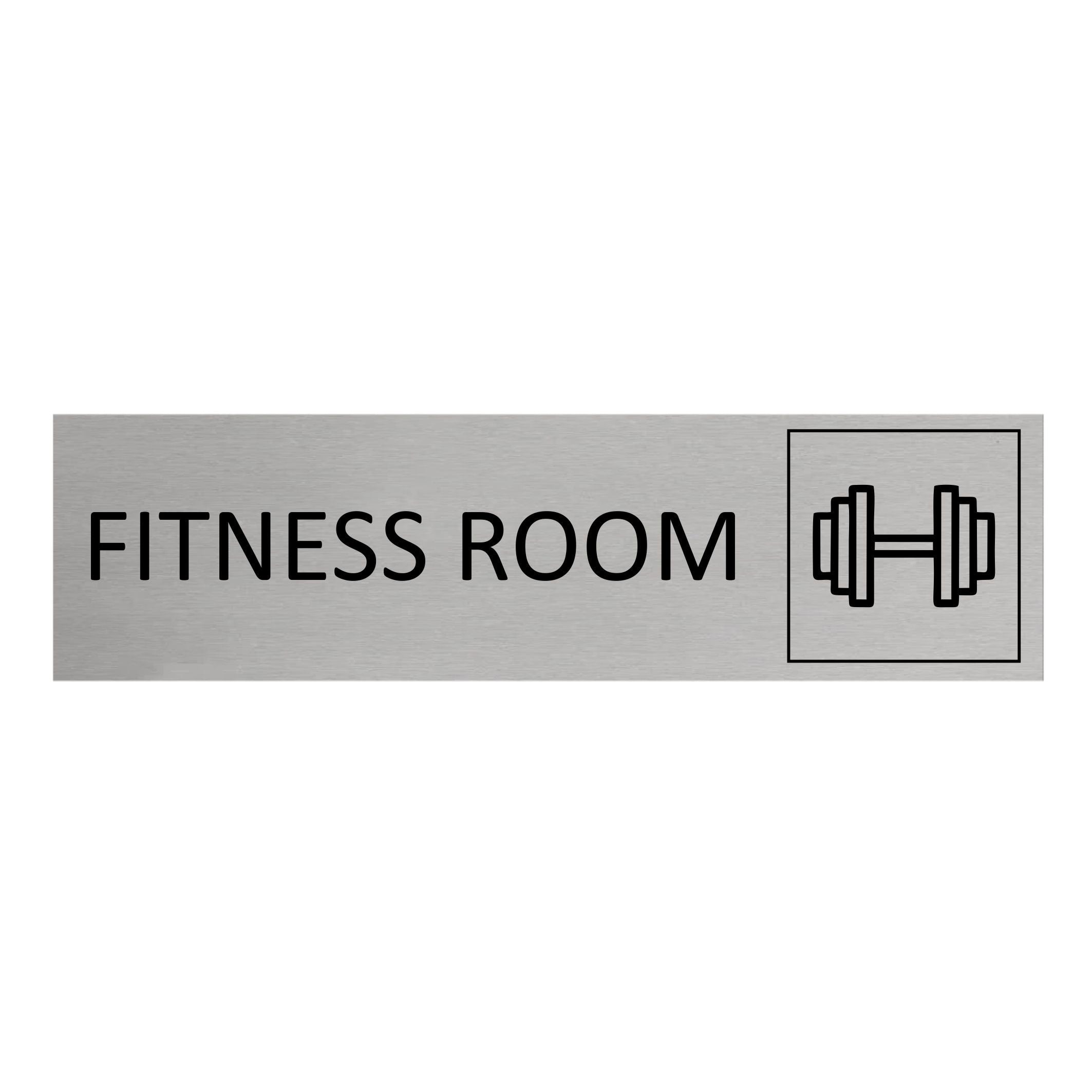 Door sign featuring the text 'Fitness room', made of silver-colored aluminum. The sign measures 165 x 45 mm and has double-sided tape for easy mounting. Suitable for indoor and outdoor use. Sold individually.