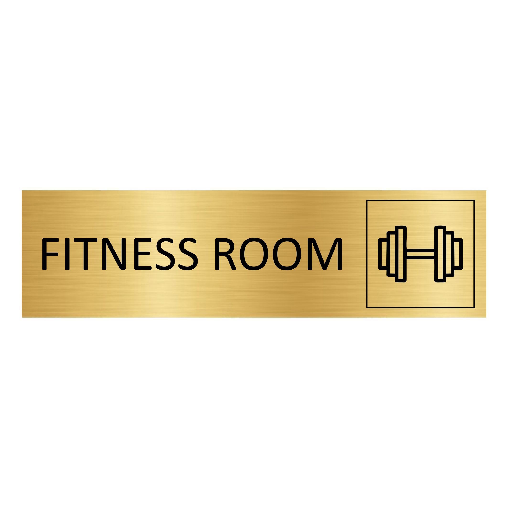 Gold-colored door sign featuring the text 'Fitness room', made of high quality aluminum. The sign measures 165 x 45 mm and has double-sided tape for easy mounting. Suitable for indoor and outdoor use. Sold individually. Read more