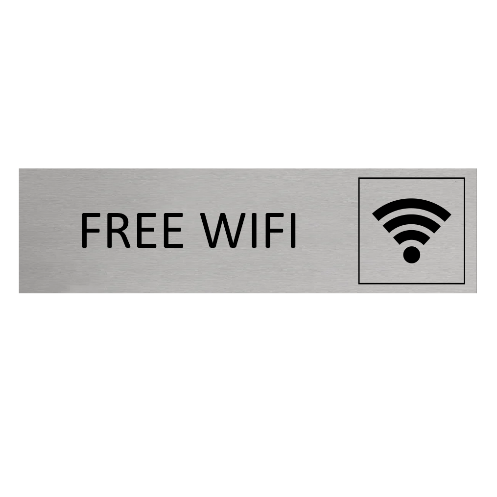 Door sign featuring the text 'Free Wi-Fi', made of silver-colored aluminum. The sign measures 165 x 45 mm and has double-sided tape for easy mounting. Suitable for indoor and outdoor use. Sold individually. Read more