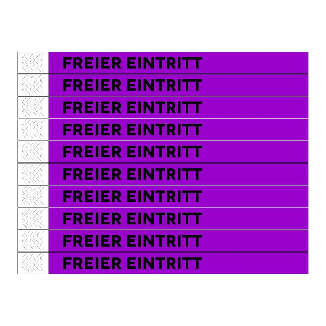 Freier eintritt Tyrex wristbands, measuring 248 x 19 mm. Used to identify guests that paid entry tickets for events. Each pack contains 100 wristbands with numbering and a strong adhesive strip.