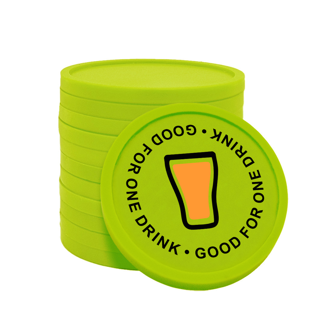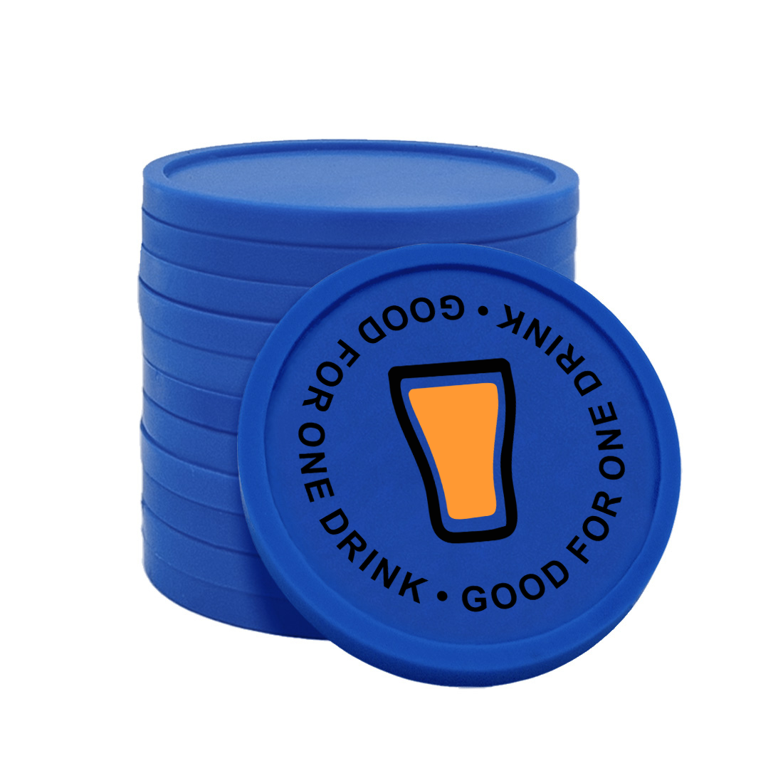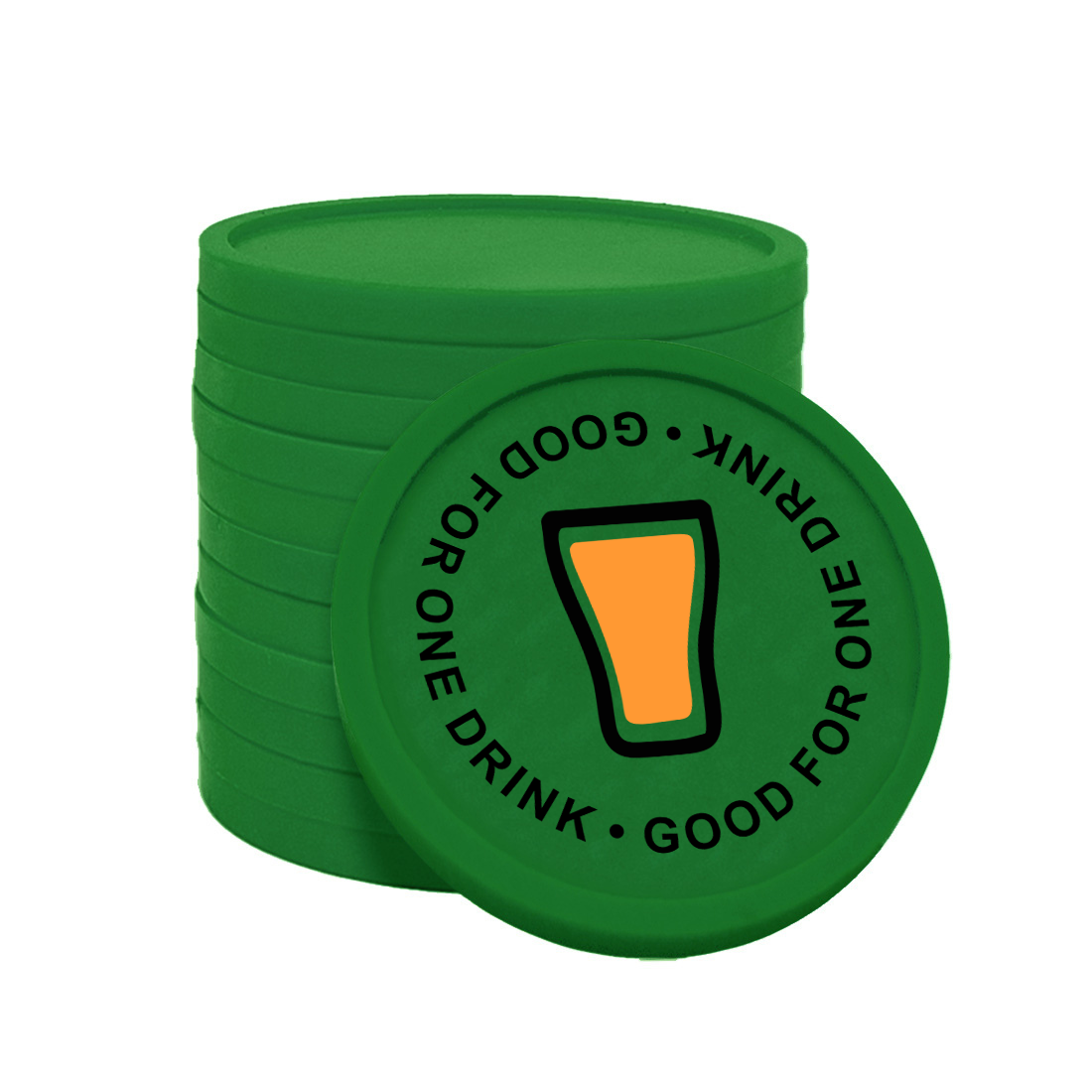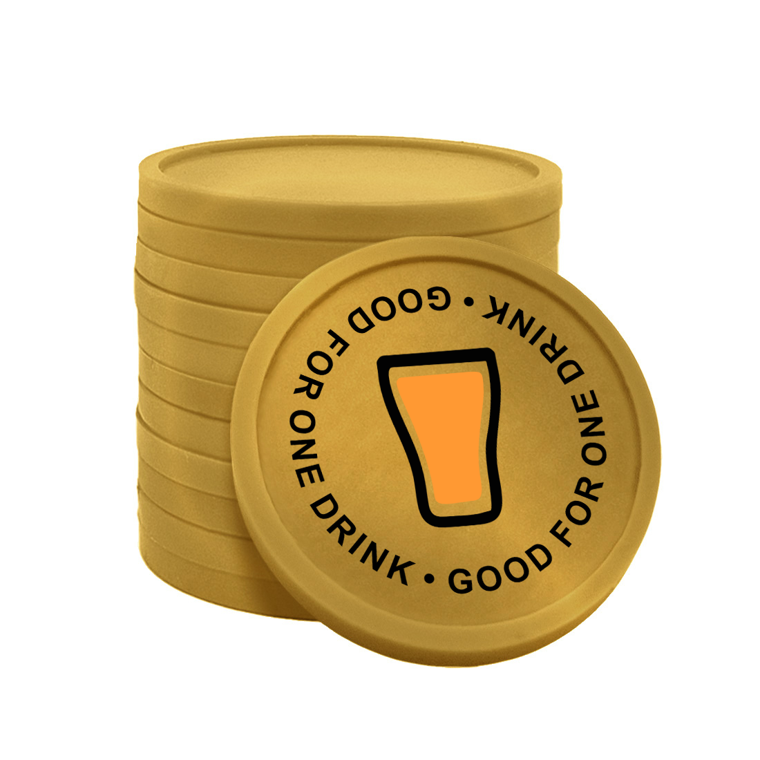 Colorful 29 mm tokens with the text "Good for one drink" for various events. The tokens have a raised edge and are approximately 2.35 mm thick. Choose one-sided print or two-sided printing. Ideal as a bar token or drink token. Sold in packs of 100 tokens.