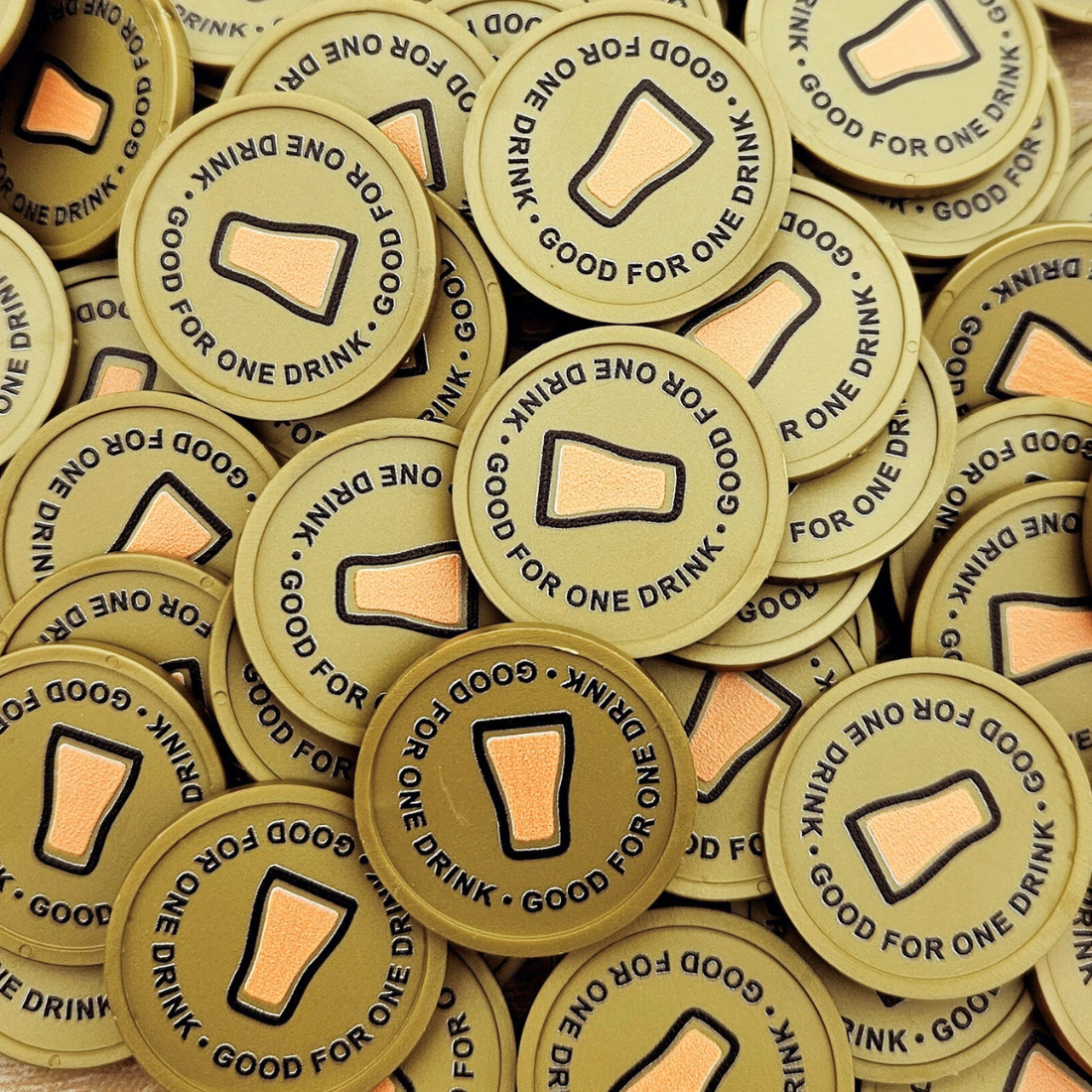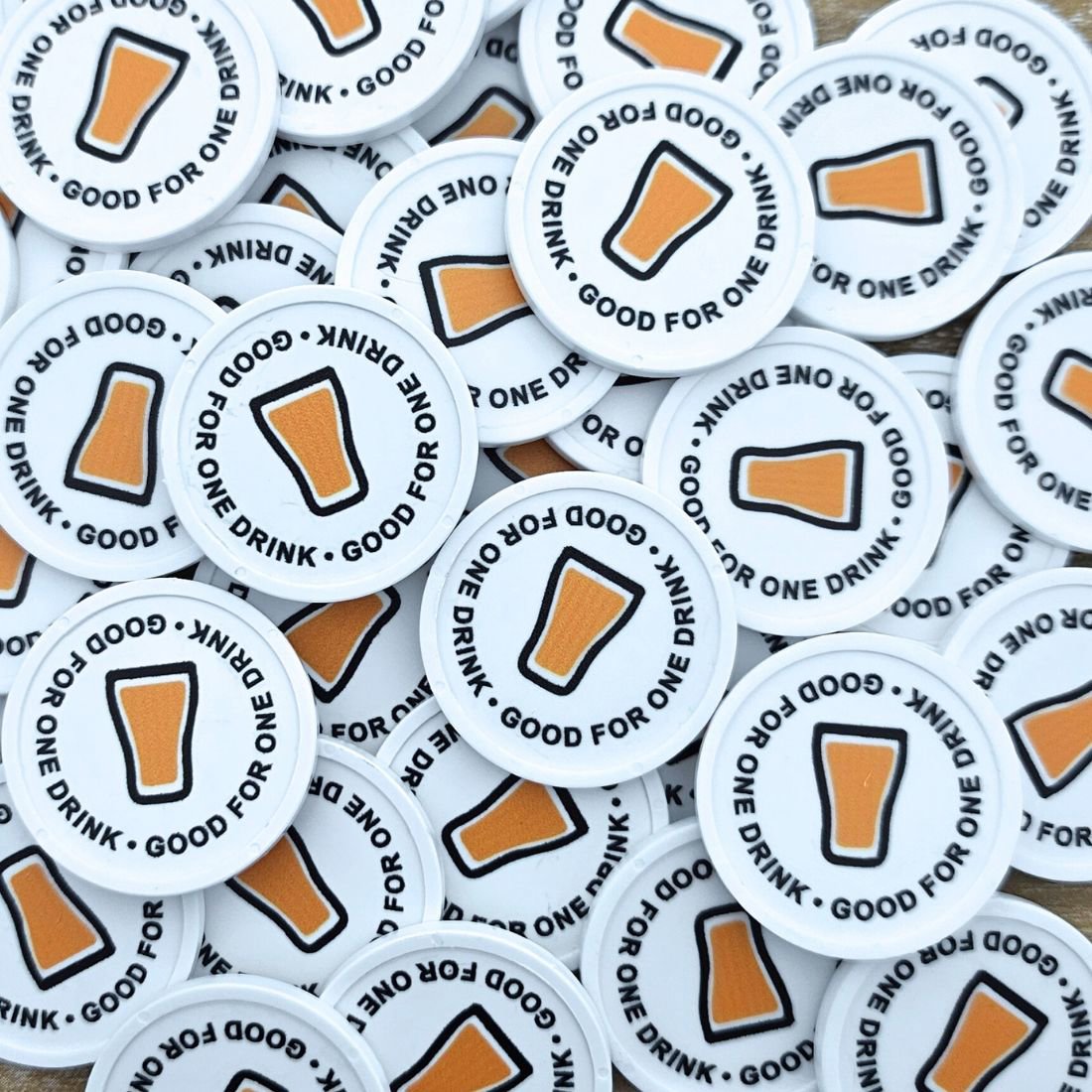 Colorful 29 mm tokens with the text "Good for one drink" for various events. The tokens have a raised edge and are approximately 2.35 mm thick. Choose one-sided print or two-sided printing. Ideal as a bar token or drink token. Sold in packs of 100 tokens.