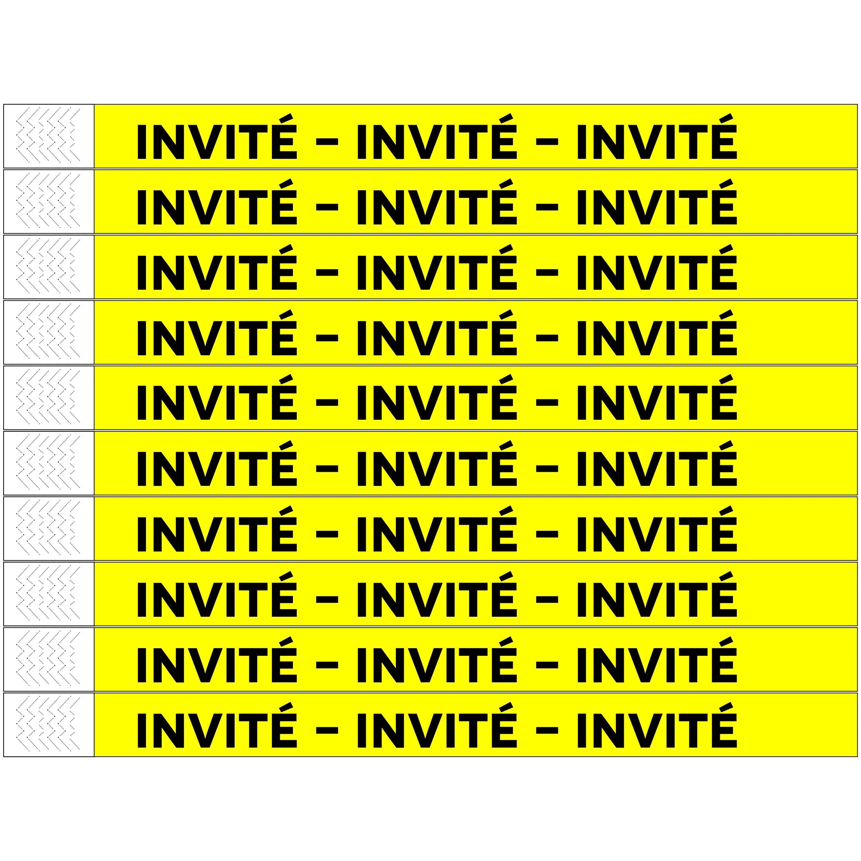 These yellow wristbands are a practical and reliable choice for parties, festivals, school trips, activities, and more. The Tyrex wristbands feature black print with the text Inivité. Each wristband measures 248 x 19 mm and fits both kids and adults comfortably. They include numbering and a strong adhesive strip with a safety closure to ensure they stay in place throughout the event.