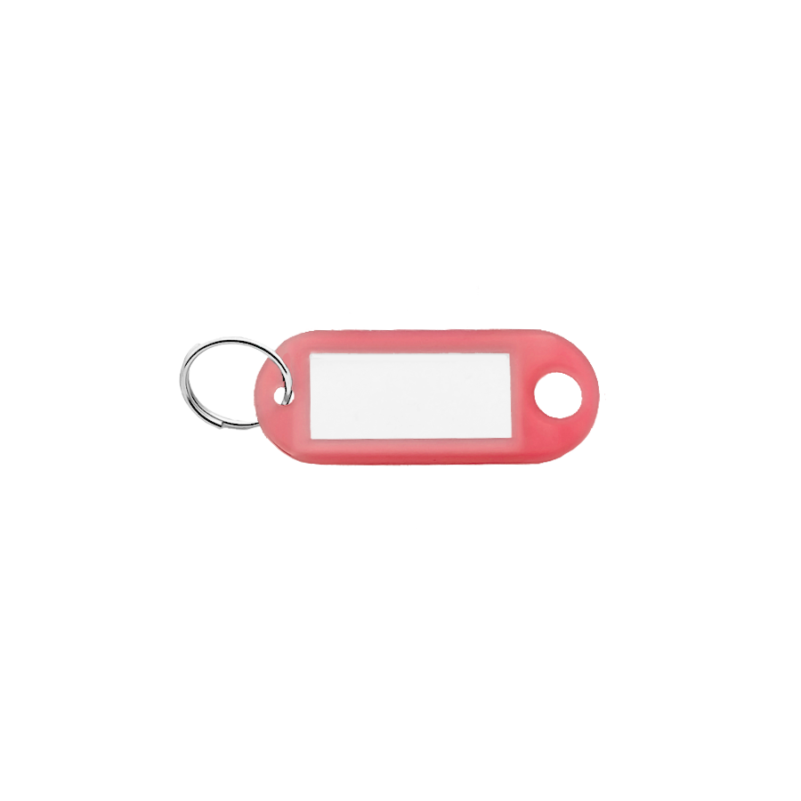 Colored key ring labels with writable paper insert. The insert is protected by a clear acetate window. Each label is 55 x 22 mm and includes a key ring. Set of 100 pieces.
