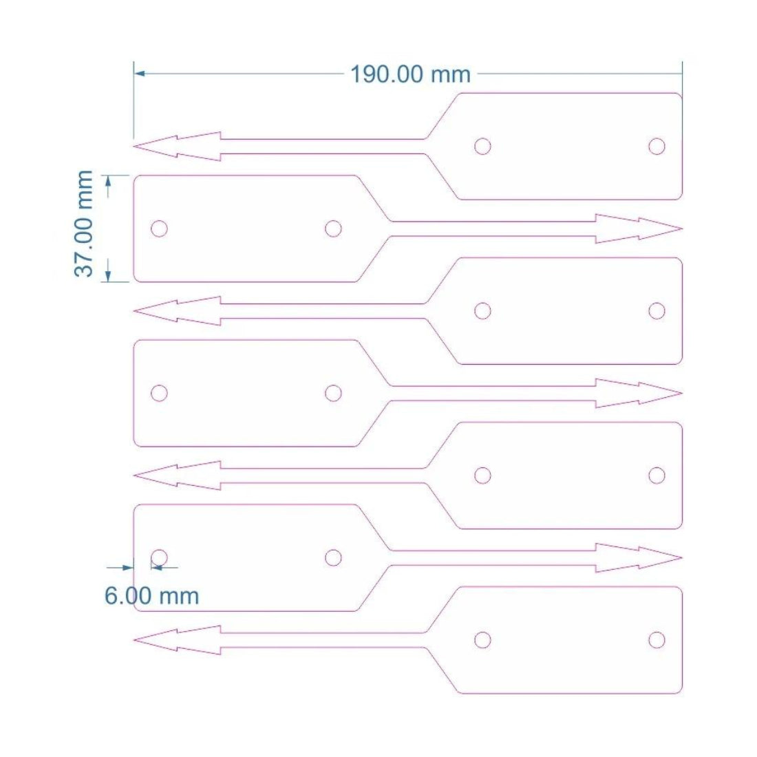 Blank blue car key tags with rat tail fastener. Practical labels for attaching to customers’ car keys, preventing keys from getting mixed up. Made of plastic and suitable for workshops and garages. Thickness: 200 microns, dimensions: 190 x 37 mm.
