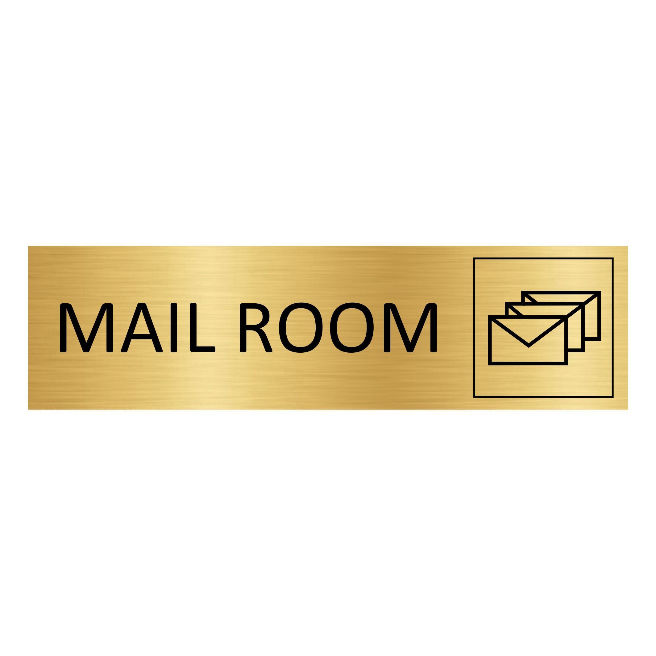 Gold-colored door sign featuring the text 'Mail room', made of high quality aluminum. The sign measures 165 x 45 mm and has double-sided tape for easy mounting. Suitable for indoor and outdoor use. Sold individually.