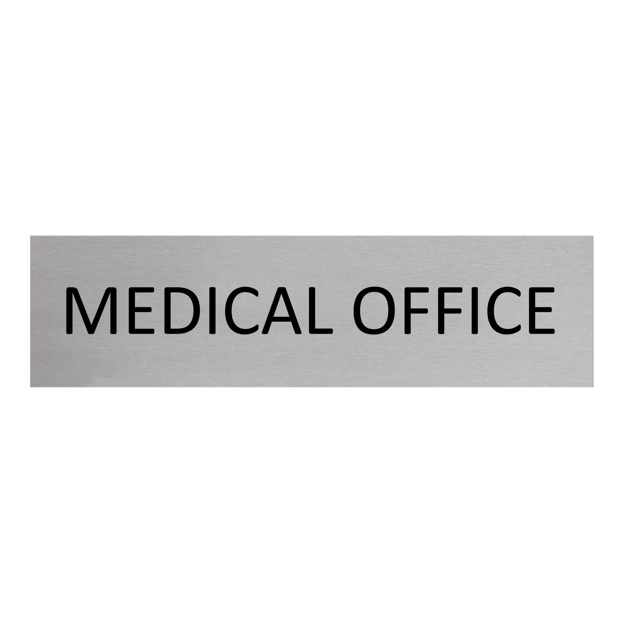 Door sign featuring the text 'Medical office', made of silver-colored aluminum. The sign measures 165 x 45 mm and has double-sided tape for easy mounting. Suitable for indoor and outdoor use. Sold individually.
