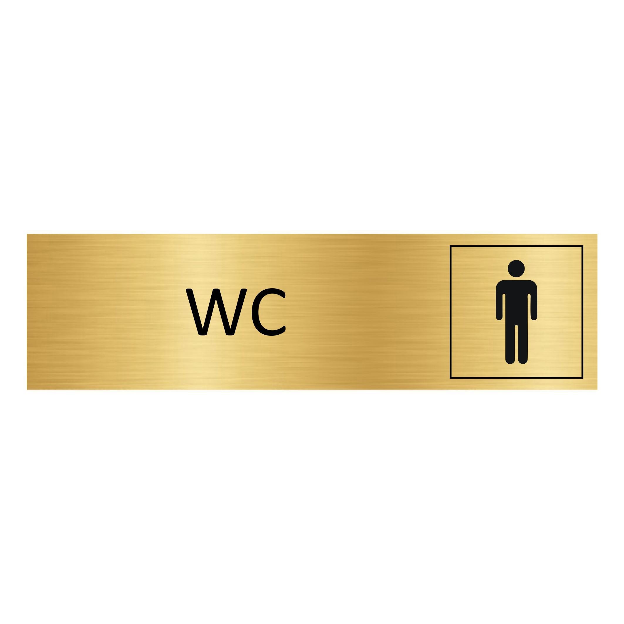 Gold-colored door sign featuring the text 'WC' for men's restrooms. Made of high quality aluminum, the sign measures 165 x 45 mm and includes double-sided tape for easy mounting. Suitable for indoor and outdoor use. Sold individually. Read more