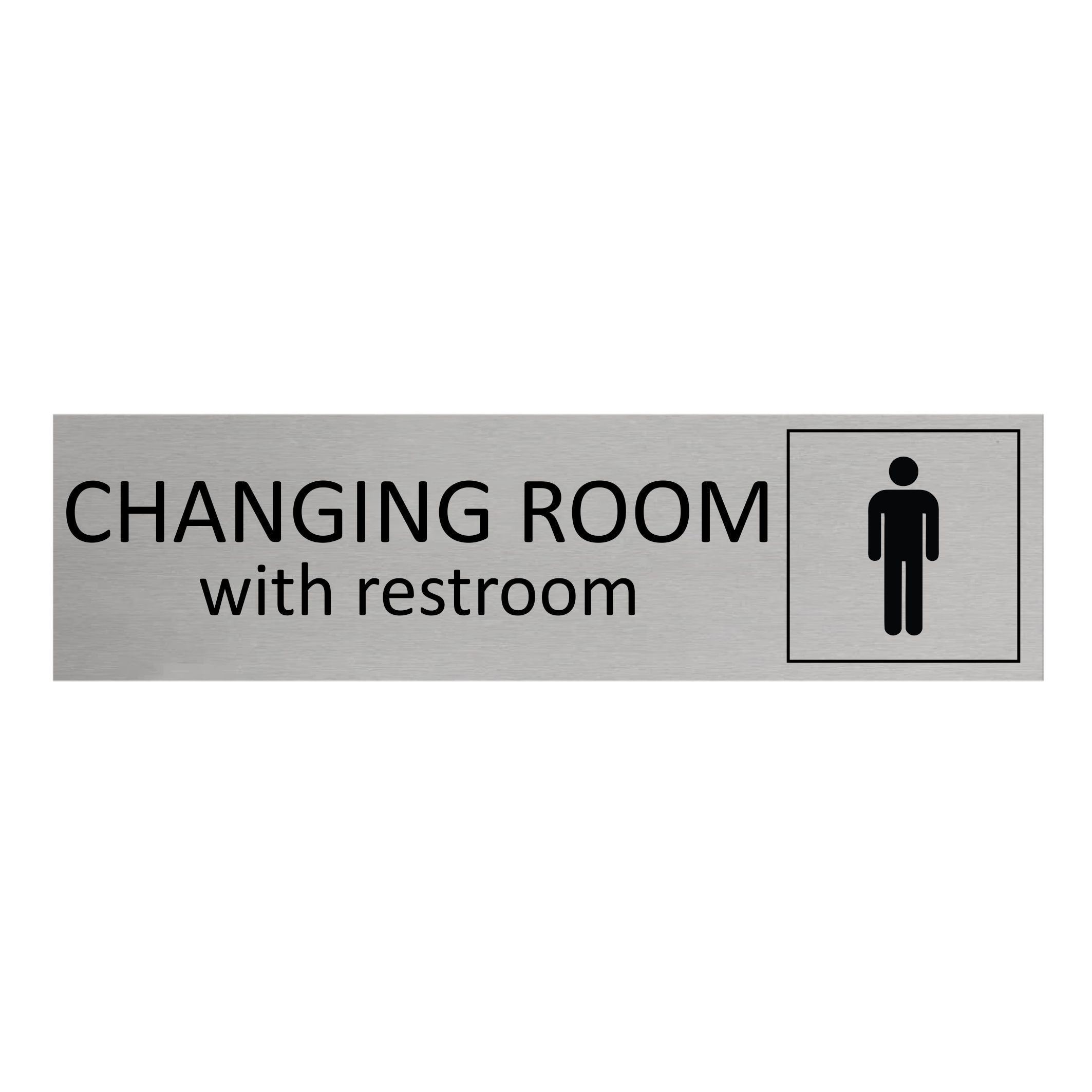 Door sign featuring the text 'Men's changing room with restroom', made of silver-colored aluminum. The sign measures 165 x 45 mm and has double-sided tape for easy mounting. Suitable for indoor and outdoor use. Sold individually. Read more