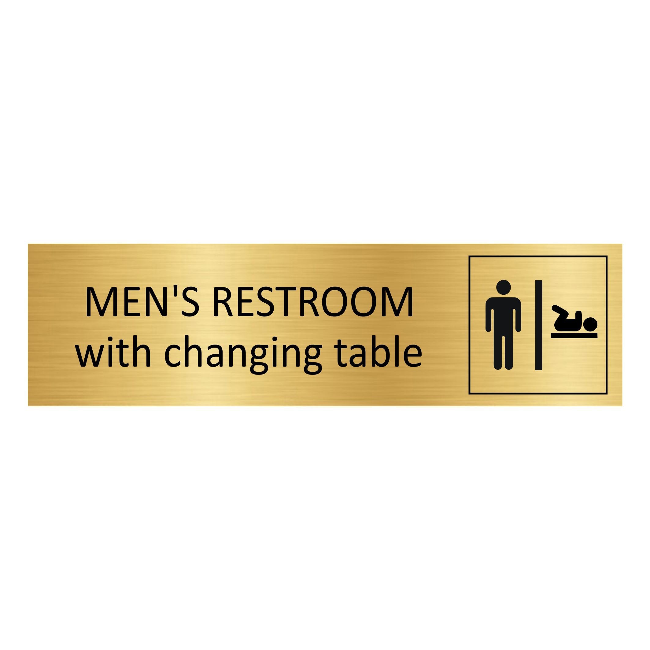 Gold-colored door sign featuring the text 'Men's restroom with changing table', made of high quality aluminum. The sign measures 165 x 45 mm and has double-sided tape for easy mounting. Suitable for indoor and outdoor use. Sold individually. Read more
