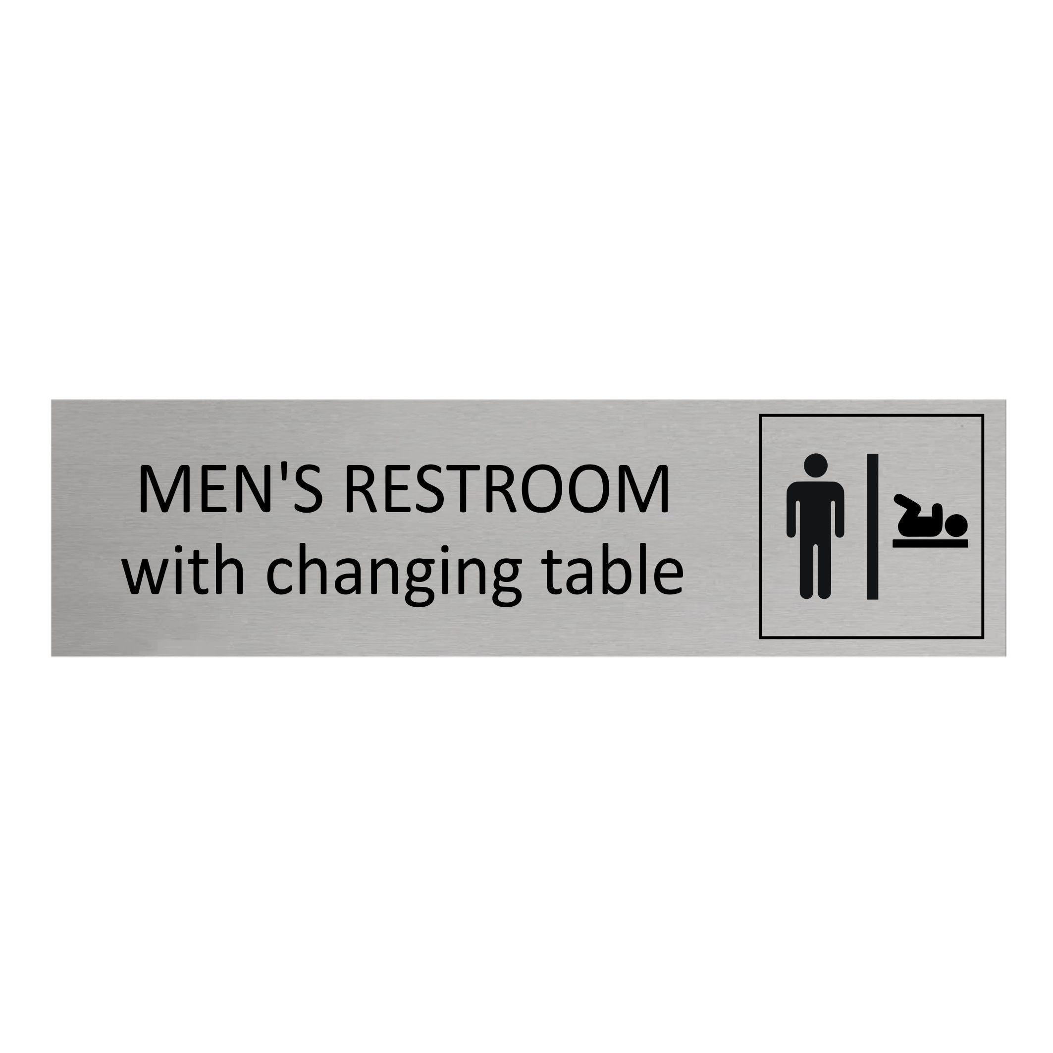 Door sign featuring the text 'Men's restroom with changing table', made of silver-colored aluminum. The sign measures 165 x 45 mm and has double-sided tape for easy mounting. Suitable for indoor and outdoor use. Sold individually.