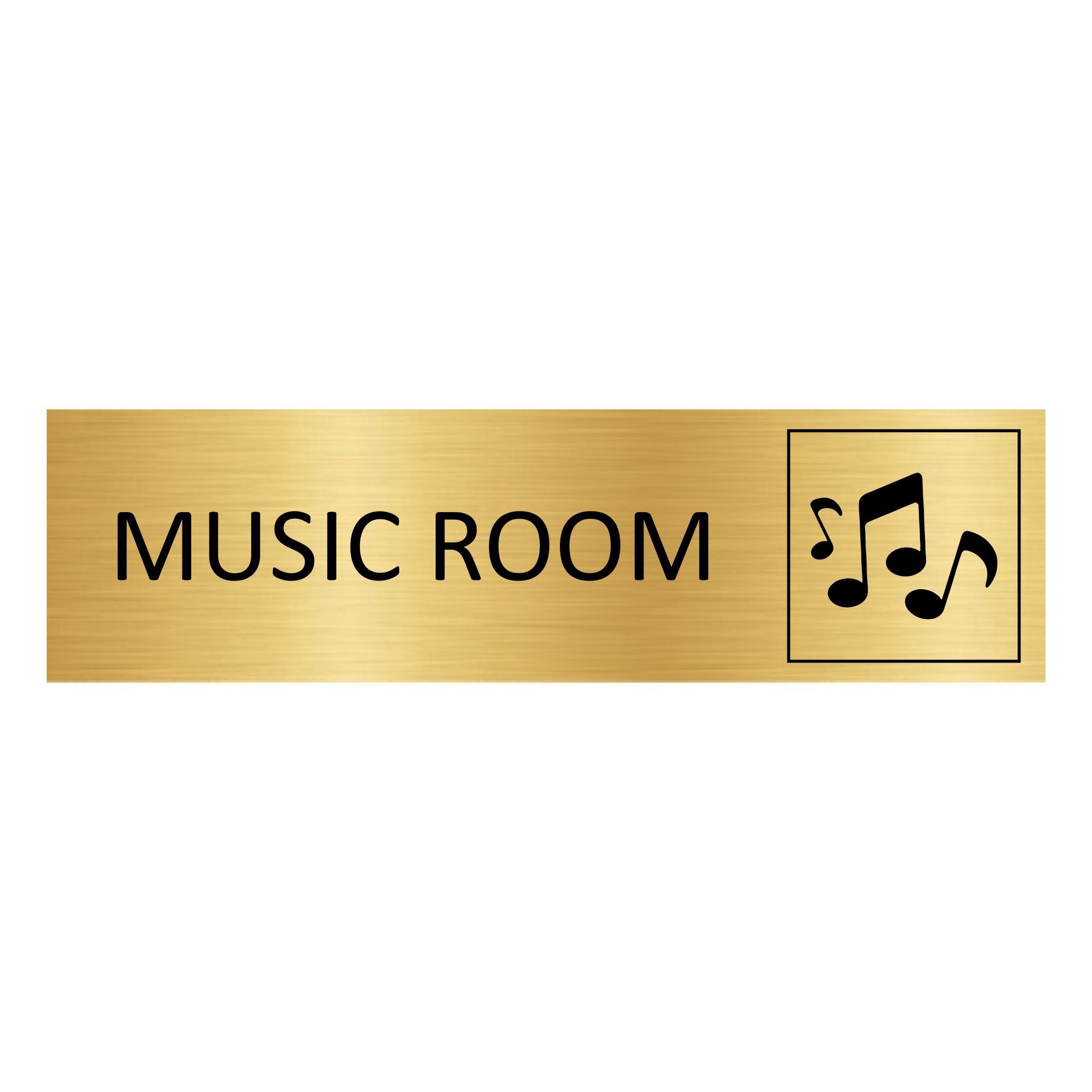 Gold-colored door sign featuring the text 'Music room', made of high quality aluminum. The sign measures 165 x 45 mm and has double-sided tape for easy mounting. Suitable for indoor and outdoor use. Sold individually.